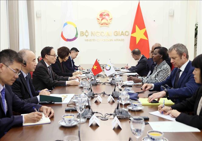 Bộ trưởng Bộ Ngoại giao Lê Hoài Trung tiếp Tổng Thư ký Pháp ngữ Louise Mushikiwabo. Ảnh: An Đăng/TTXVN