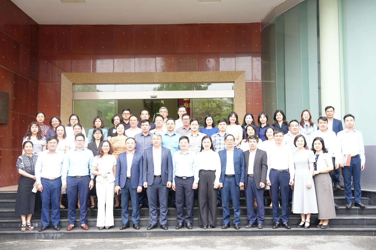 Bộ trưởng Nguyễn Hải Ninh, Thứ trưởng Mai Lương Khôi chụp ảnh lưu niệm cùng các đại biểu.
