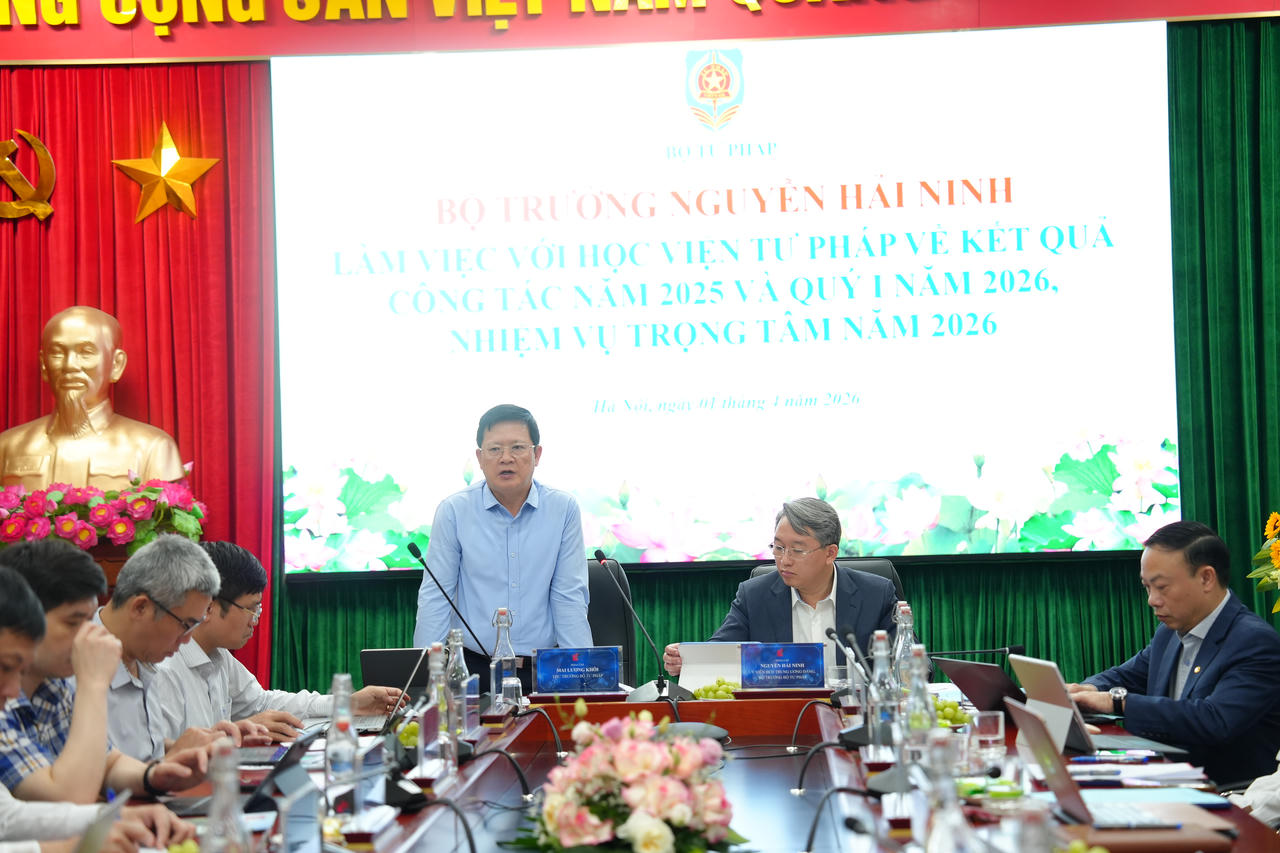 Phát biểu chỉ đạo tại buổi làm việc, Bộ trưởng Bộ Tư pháp Nguyễn Hải Ninh ghi nhận, biểu dương những kết quả toàn diện mà Học viện Tư pháp đã đạt được trong thời gian qua. Bộ trưởng nhấn mạnh, trong bối cảnh nhiều khó khăn, Học viện đã chủ động sắp xếp, tinh gọn tổ chức bộ máy từ 16 xuống còn 14 đơn vị; kiện toàn đội ngũ cán bộ chủ chốt, giữ vững sự đoàn kết, thống nhất nội bộ.