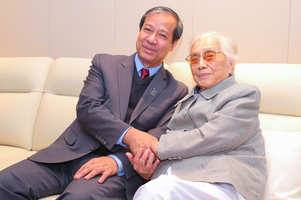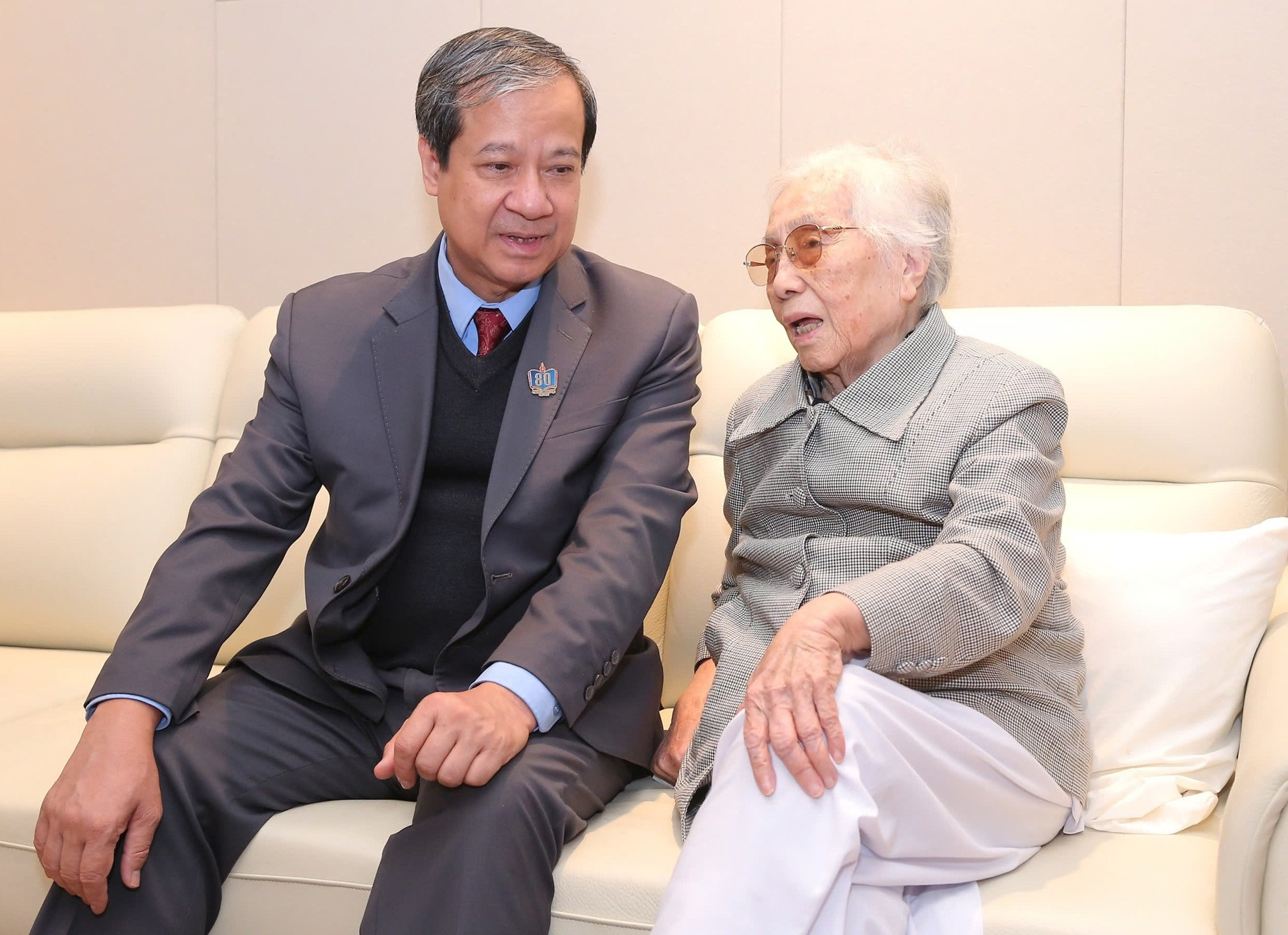 Bộ trưởng GD-ĐT Nguyễn Kim Sơn thăm, chúc mừng và chia sẻ với nguyên Phó Chủ tịch nước, nguyên Bộ trưởng GD-ĐT Nguyễn Thị Bình về những công việc của ngành Giáo dục. Ảnh: Trần Hiệp