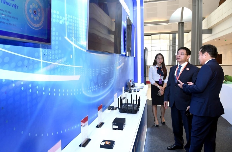 Bí thư Đảng ủy, Bộ trưởng Bộ Tài chính Nguyễn Văn Thắng thăm gian hàng của Tập đoàn Bưu chính Viễn thông Việt Nam (VNPT) và trao đổi với Tổng giám đốc Tập đoàn VNPT Huỳnh Quang Liêm.