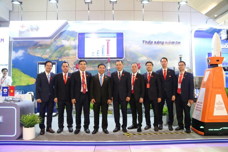 Bí thư Đảng ủy, Bộ trưởng Bộ Tài chính Nguyễn Văn Thắng chụp ảnh lưu niệm tại gian hàng của Tập đoàn Điện lực Việt Nam (EVN).