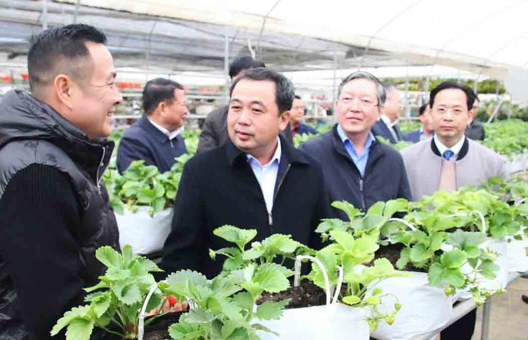 Đồng chí Trần Đức Thắng, Bộ trưởng Nông nghiệp và Môi trường thăm khu vực trồng dâu tây của hợp tác xã dịch vụ và nông nghiệp Bon Bon.