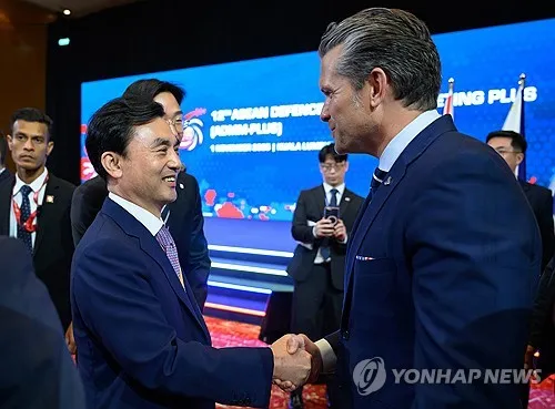 Bộ trưởng Quốc phòng Hàn Quốc Ahn Gyu-back (trái) và Bộ trưởng Quốc phòng Mỹ Pete Hegseth bắt tay nhau bên lề Hội nghị Bộ trưởng Quốc phòng ASEAN mở rộng (ADMM-Plus) tại Malaysia ngày 1-11. Ảnh: YONHAP