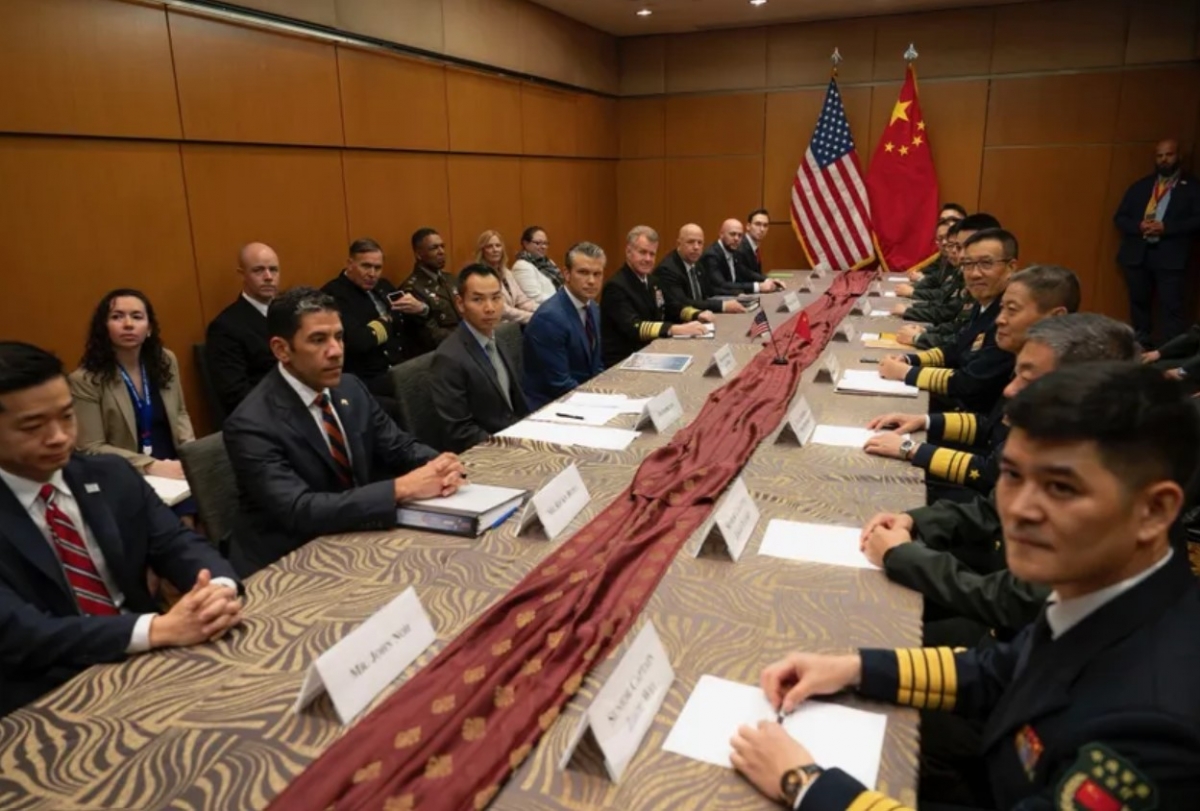 Phái đoàn của Bộ trưởng Quốc phòng Mỹ Pete Hegseth (trái) và Bộ trưởng Quốc phòng Trung Quốc Đổng Quân trong cuộc gặp tại Malaysia ngày 31/10. Ảnh: X