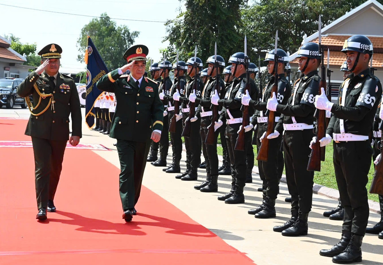 Đại tướng Phan Văn Giang và Đại tướng Tea Seiha duyệt Đội danh dự tại Bộ Tư lệnh Hiến binh tỉnh Svay Rieng.