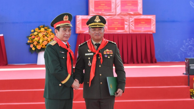 Đại tướng Phan Văn Giang, Ủy viên Bộ Chính trị, Phó Bí thư Quân ủy Trung ương, Bộ trưởng Quốc phòng Việt Nam và Đại tướng Tea Seiha, Phó Thủ tướng Chính phủ, Bộ trưởng Quốc phòng Vương quốc Campuchia tặng quà nhà trường.