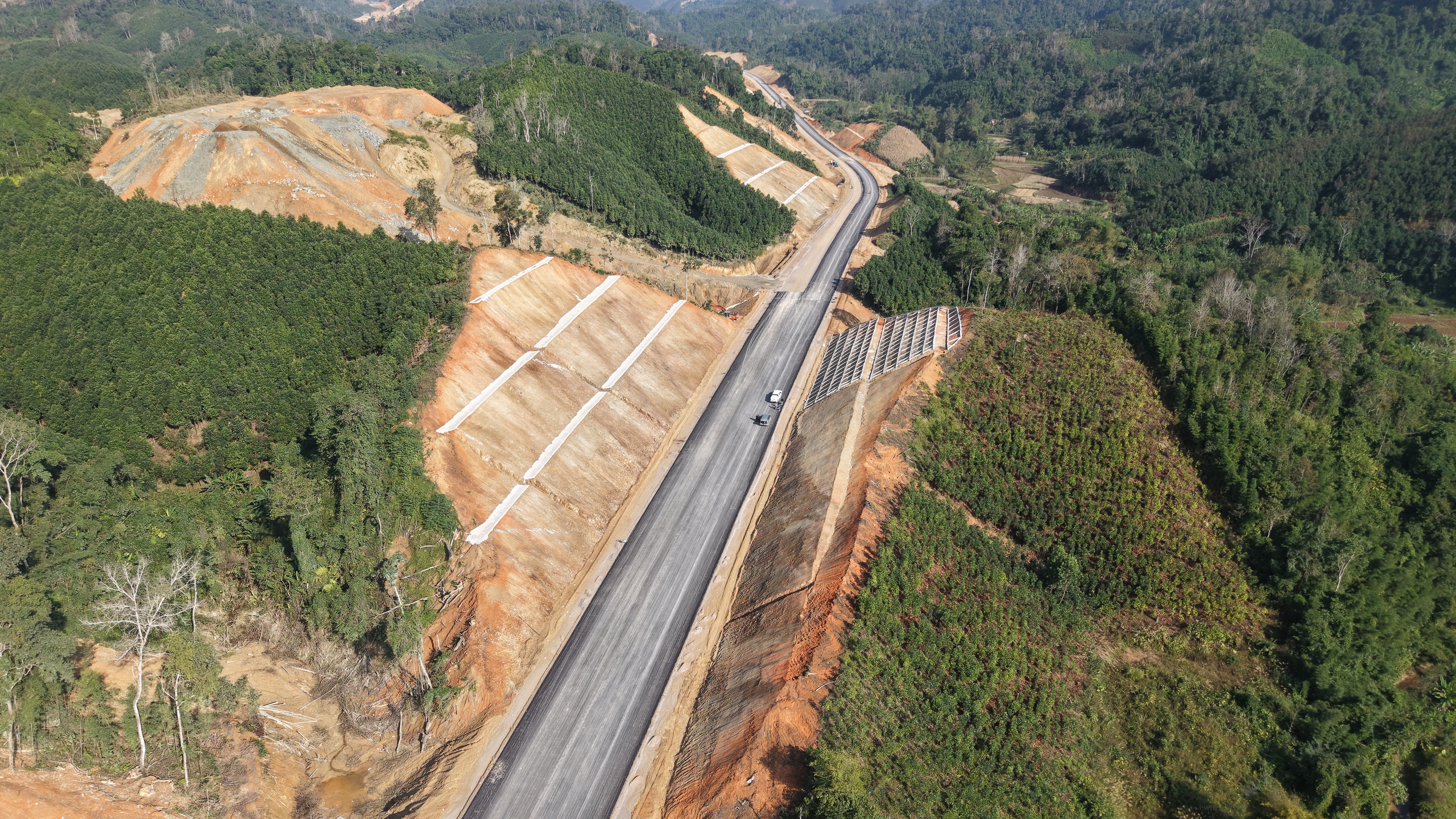 Cụ thể, đã thi công mở nền thông toàn tuyến, trong đó đã thảm bê tông mặt đường được 16 km; rải cấp phối đá dăm được 21km. Đã hoàn thành đào đắp nền đường đất đạt độ chặt K98 được 13km; đã hoàn thành 33/38 cầu toàn tuyến. Nhà đầu tư và các nhà thầu sẽ phấn đấu hoàn thành dự án trong tháng 9/2026 vượt tiến độ 3 tháng so với kế hoạch.