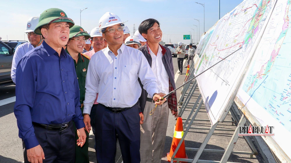 Bộ trưởng Bộ Xây dựng Trần Hồng Minh (bìa trái) đến kiểm tra công tác tổ chức thi công dự án cao tốc Cần Thơ - Cà Mau. Ảnh: CHÂU ANH