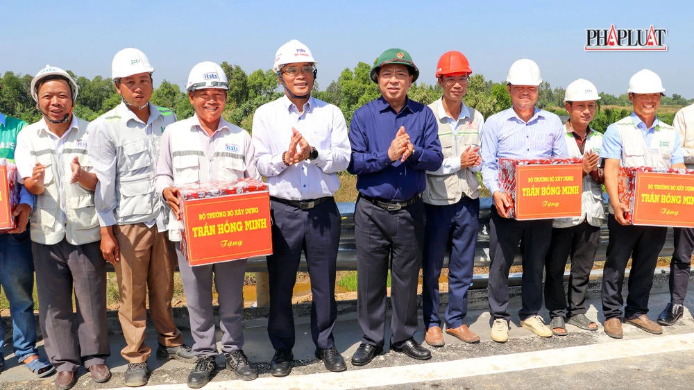 Bộ trưởng Bộ Xây dựng tặng quà, động viên kỹ sư, công nhân, người lao động đang thi công tại đoạn Hậu Giang - Cà Mau. Ảnh: CHÂU ANH