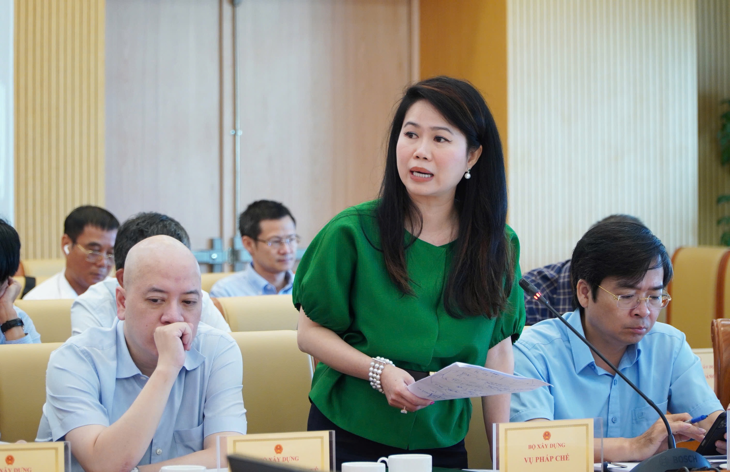 Vụ trưởng Vụ Pháp chế Trần Thị Minh Hiền báo cáo về công tác xây dựng, hoàn thiện thể chế, tháo gỡ vướng mắc, bất cập các quy định pháp luật trong lĩnh vực Xây dựng 9 tháng đầu năm 2025.