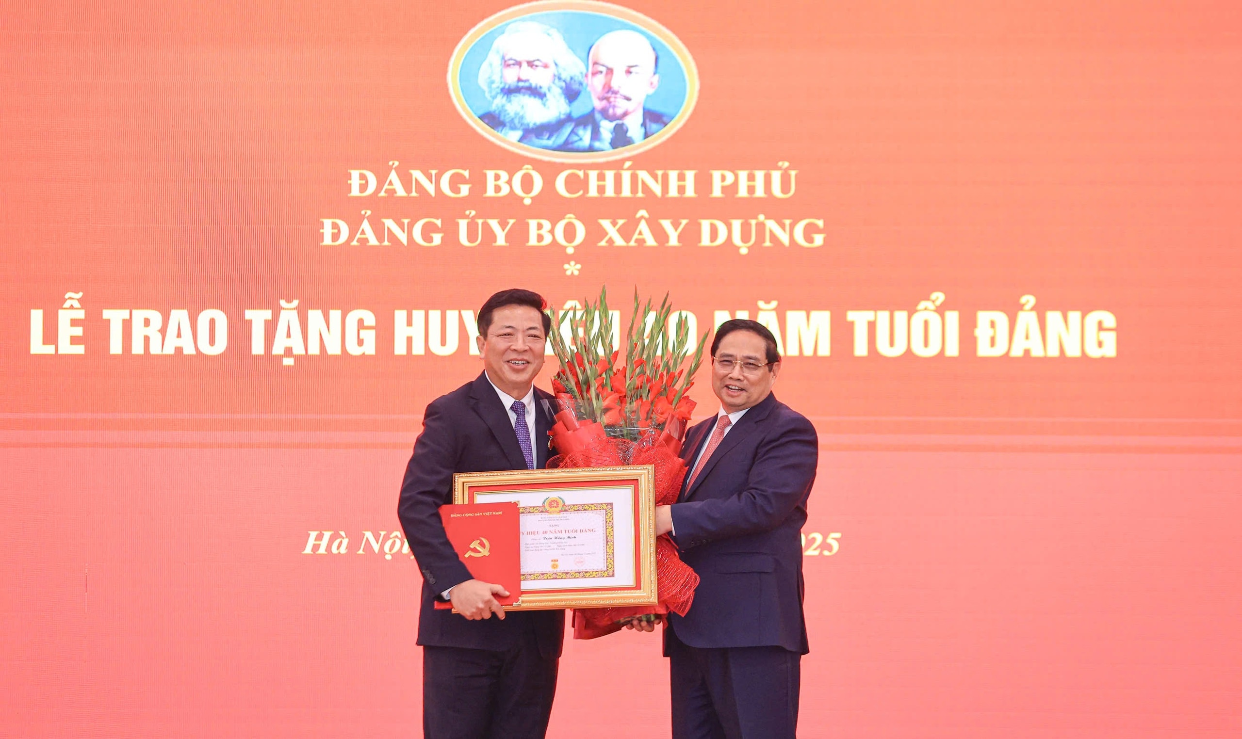 Thủ tướng Phạm Minh Chính trao Huy hiệu 40 năm tuổi Đảng cho Bộ trưởng Bộ Xây dựng Trần Hồng Minh