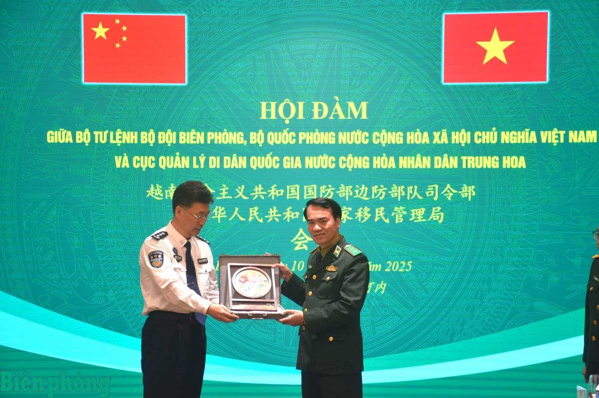 Trung tướng Vũ Trung Kiên trao quà lưu niệm của Bộ Tư lệnh BĐBP Việt Nam tặng Cục Quản lý Di dân Quốc gia Trung Quốc. Ảnh: Tuấn Khang