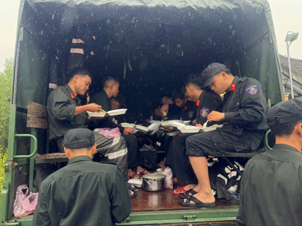 Bữa cơm ăn vội của cán bộ chiến CSCĐ trong vùng lũ.