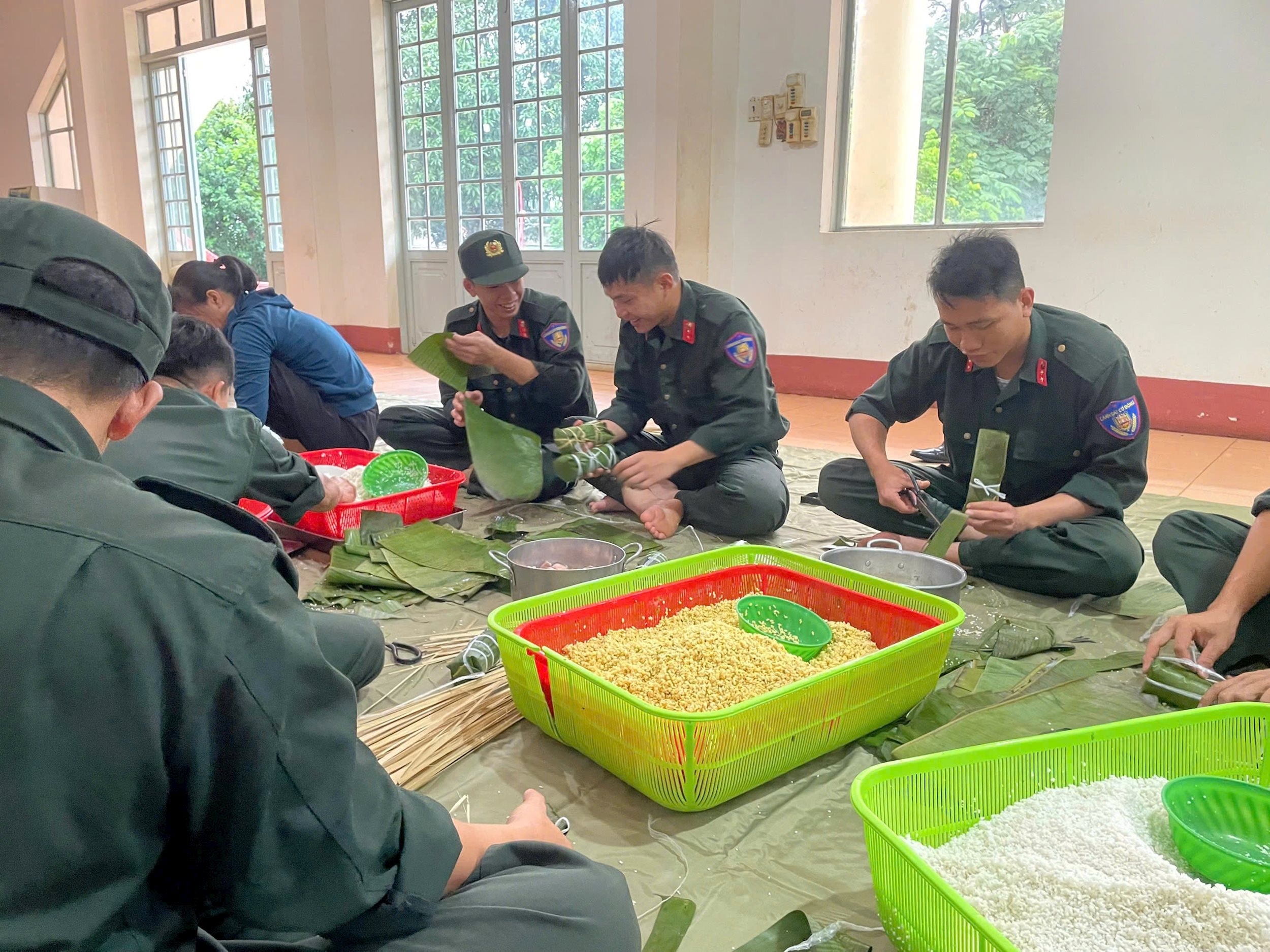 Các chiến sĩ gói bánh chưng để mang tới cứu trợ người dân vùng "rốn lũ".