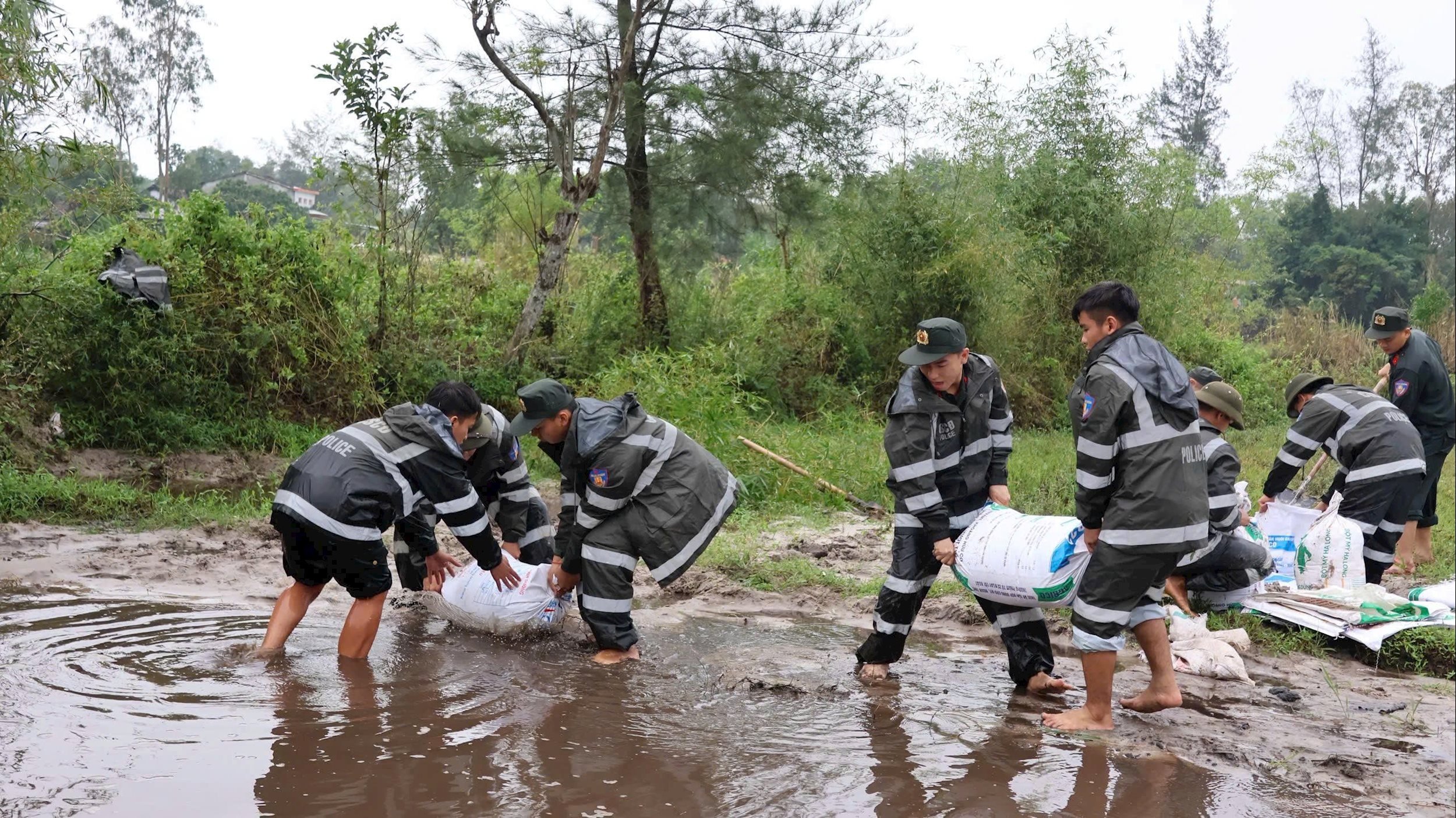 Cán bộ, chiến sĩ phải làm việc trong điều kiện mưa lớn.