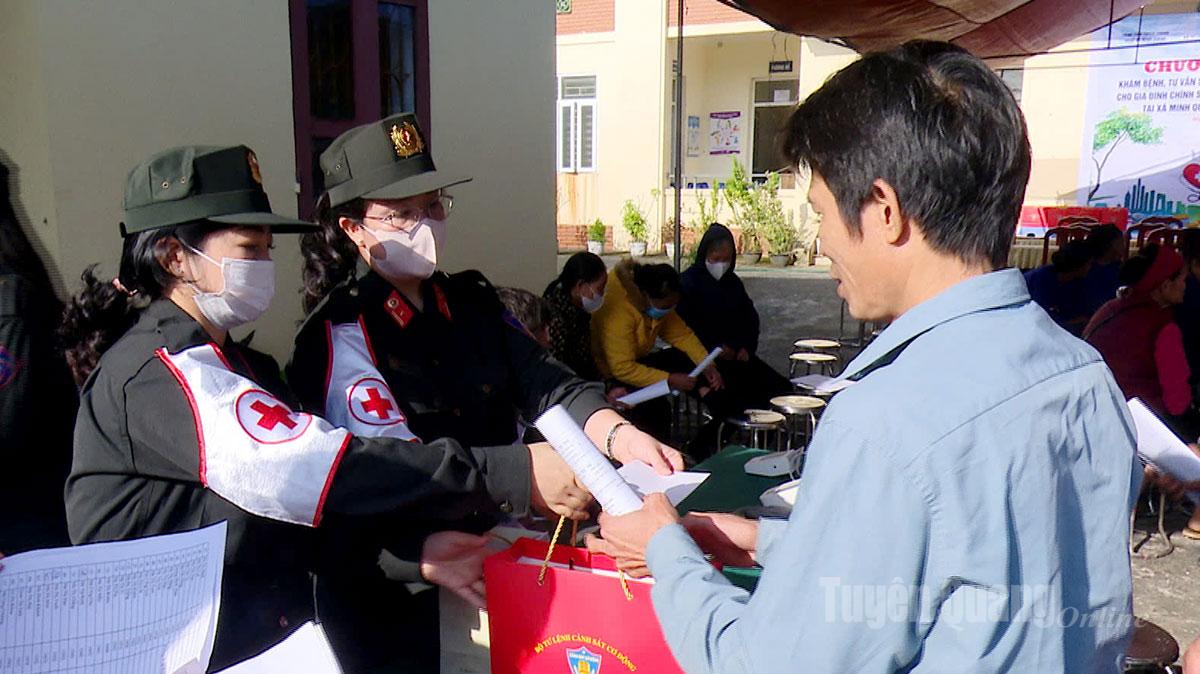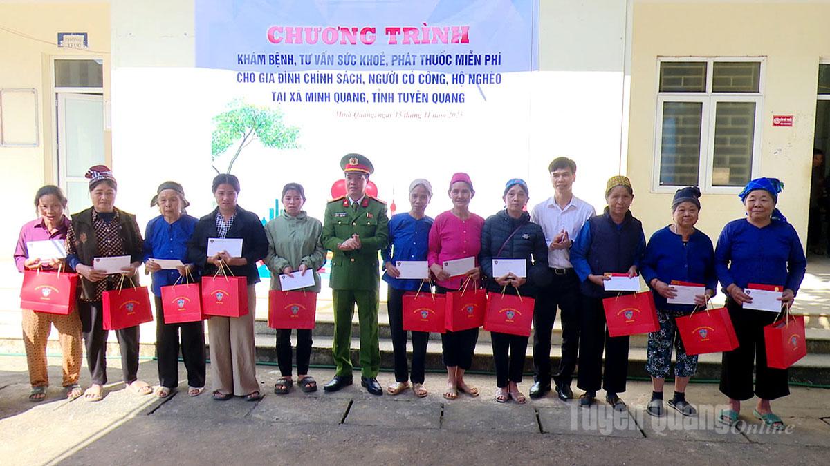 Đoàn cán bộ y, bác sĩ của Bộ Tư lệnh cảnh sát cơ động phát thuốc miễn phí cho người dân trên địa bàn xã Minh Quang.