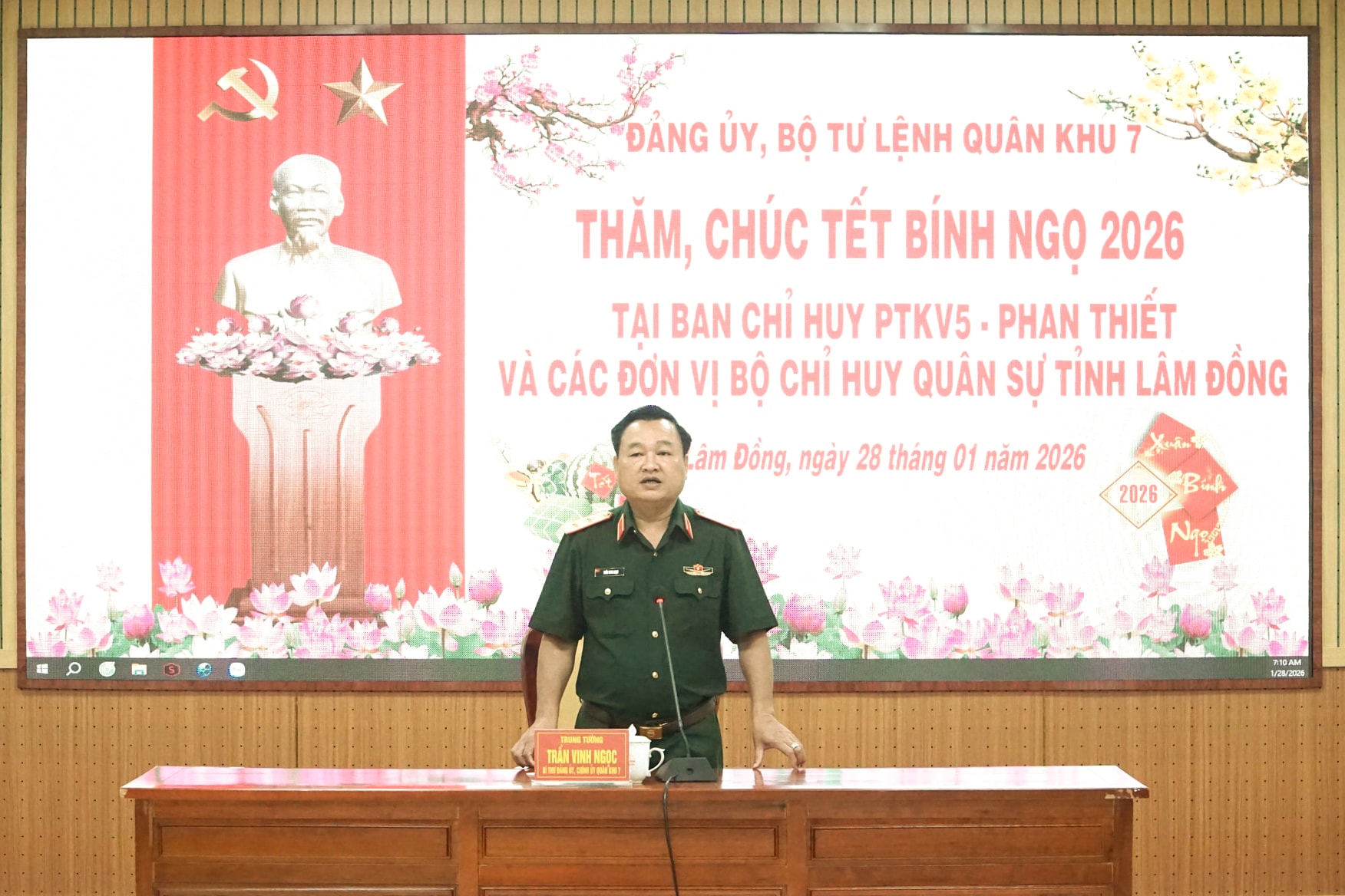 Phát biểu tại buổi thăm và chúc Tết, Trung tướng Trần Vinh Ngọc ghi nhận, biểu dương những kết quả mà các đơn vị thuộc Bộ CHQS tỉnh Lâm Đồng, trong đó có Ban Chỉ huy Phòng thủ Khu vực 5 – Phan Thiết đã đạt được trong thời gian qua.