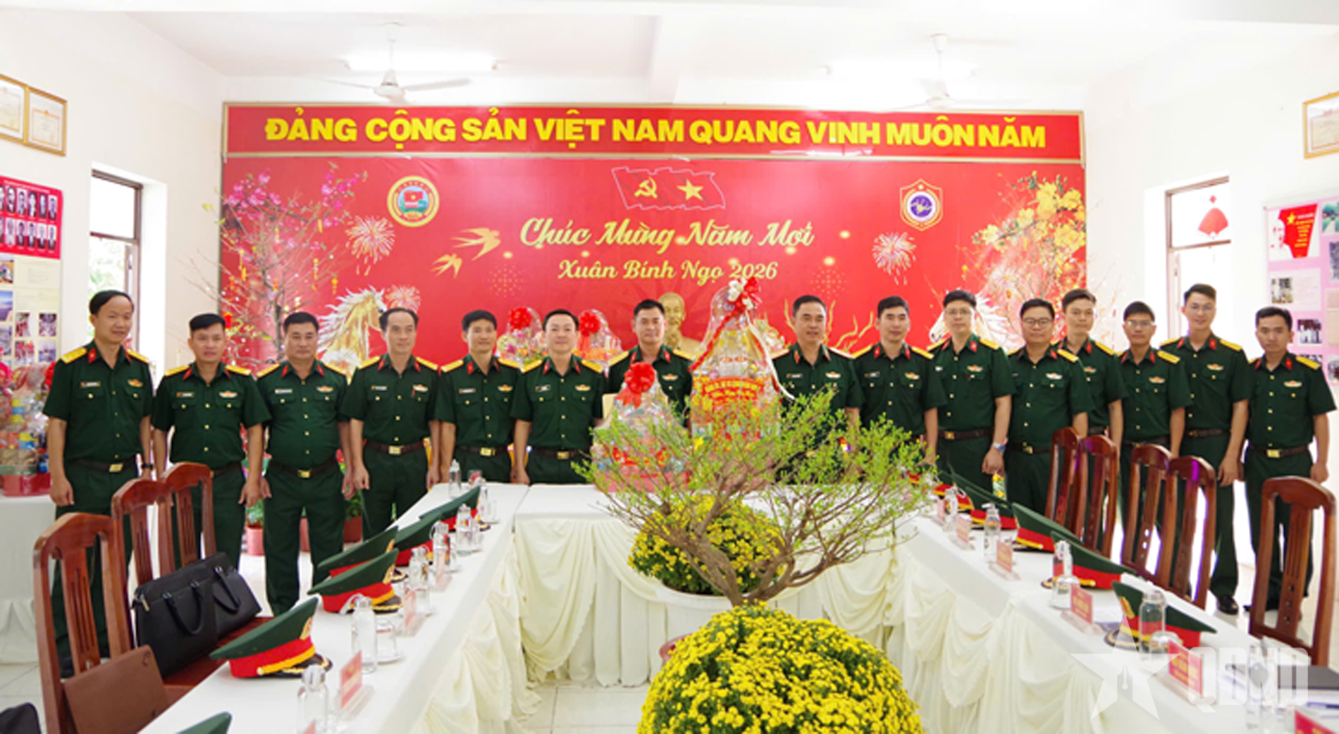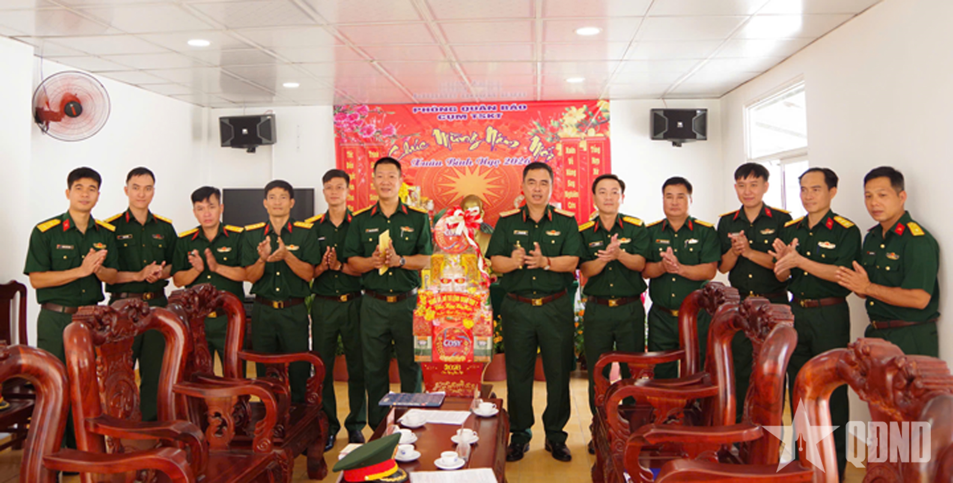 Thiếu tướng Lê Xuân Bình (thứ sáu, bên phải sang) tặng quà, chúc Tết Cụm Trinh sát Kỹ thuật, Phòng Quân báo, Bộ Tham mưu Quân khu 7.