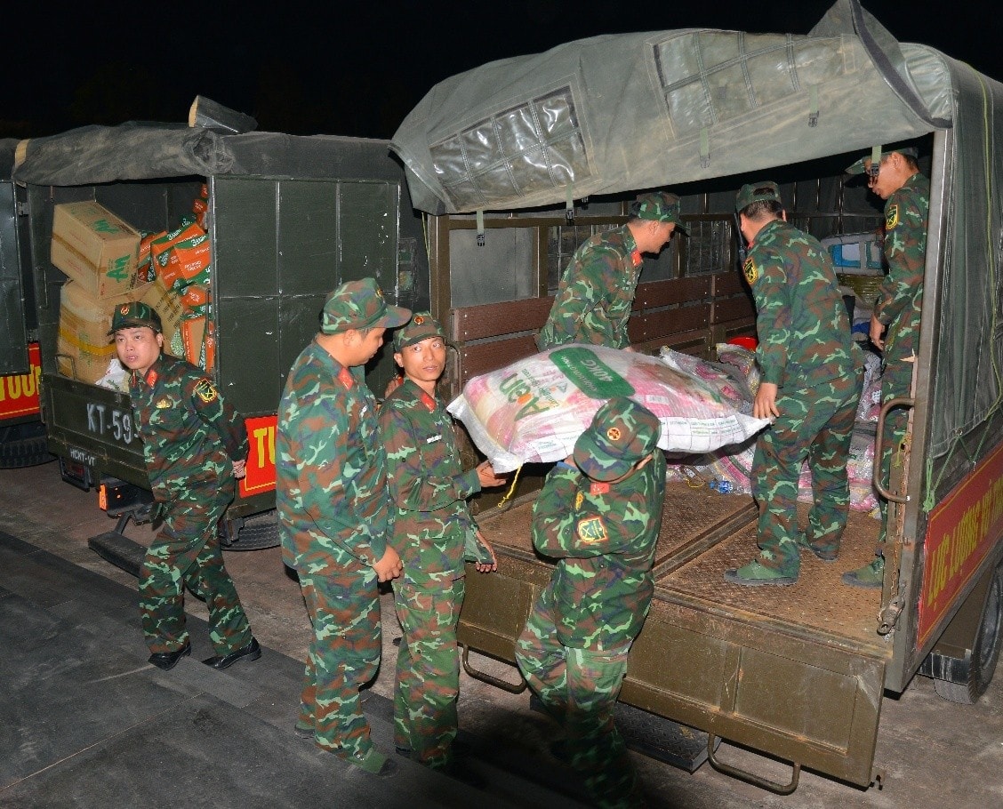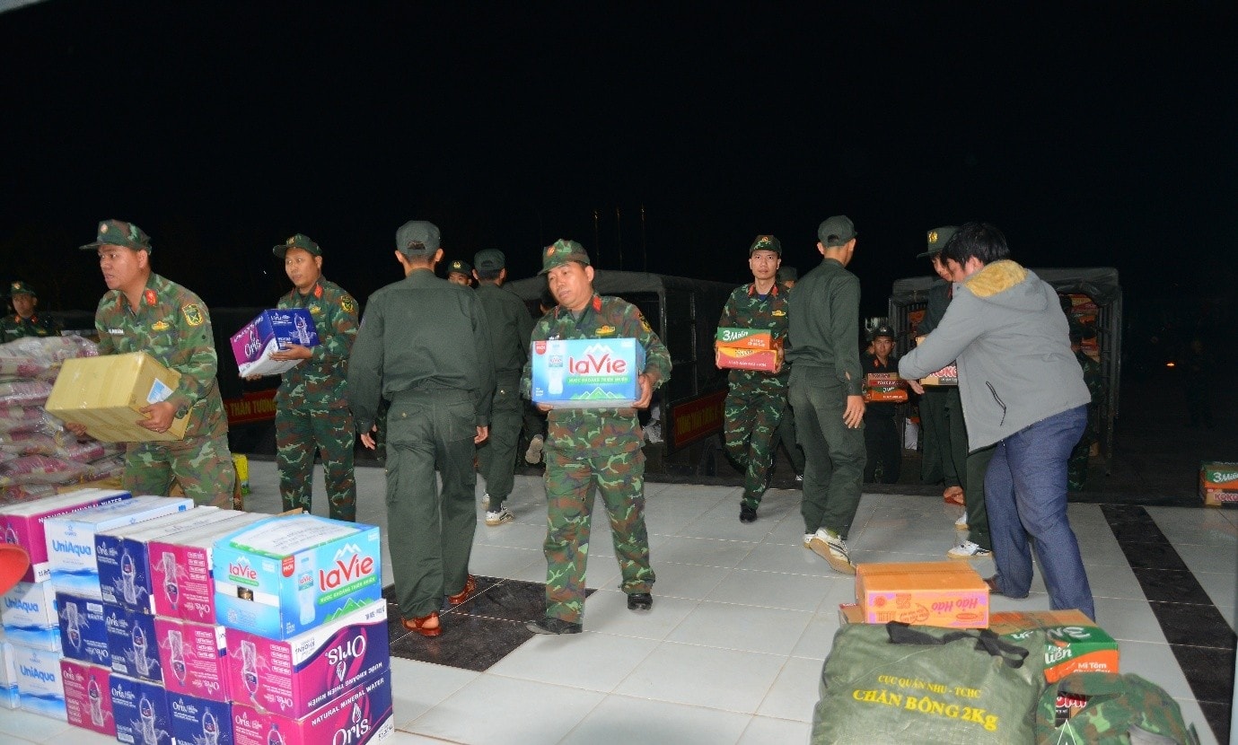 Đúng 20h ngày 28-11, đoàn xe của Bộ Tư lệnh Thủ đô Hà Nội đến Trung tâm Thanh thiếu nhi Bình Định, nơi tập kết hàng hóa cứu trợ đồng bào Gia Lai.