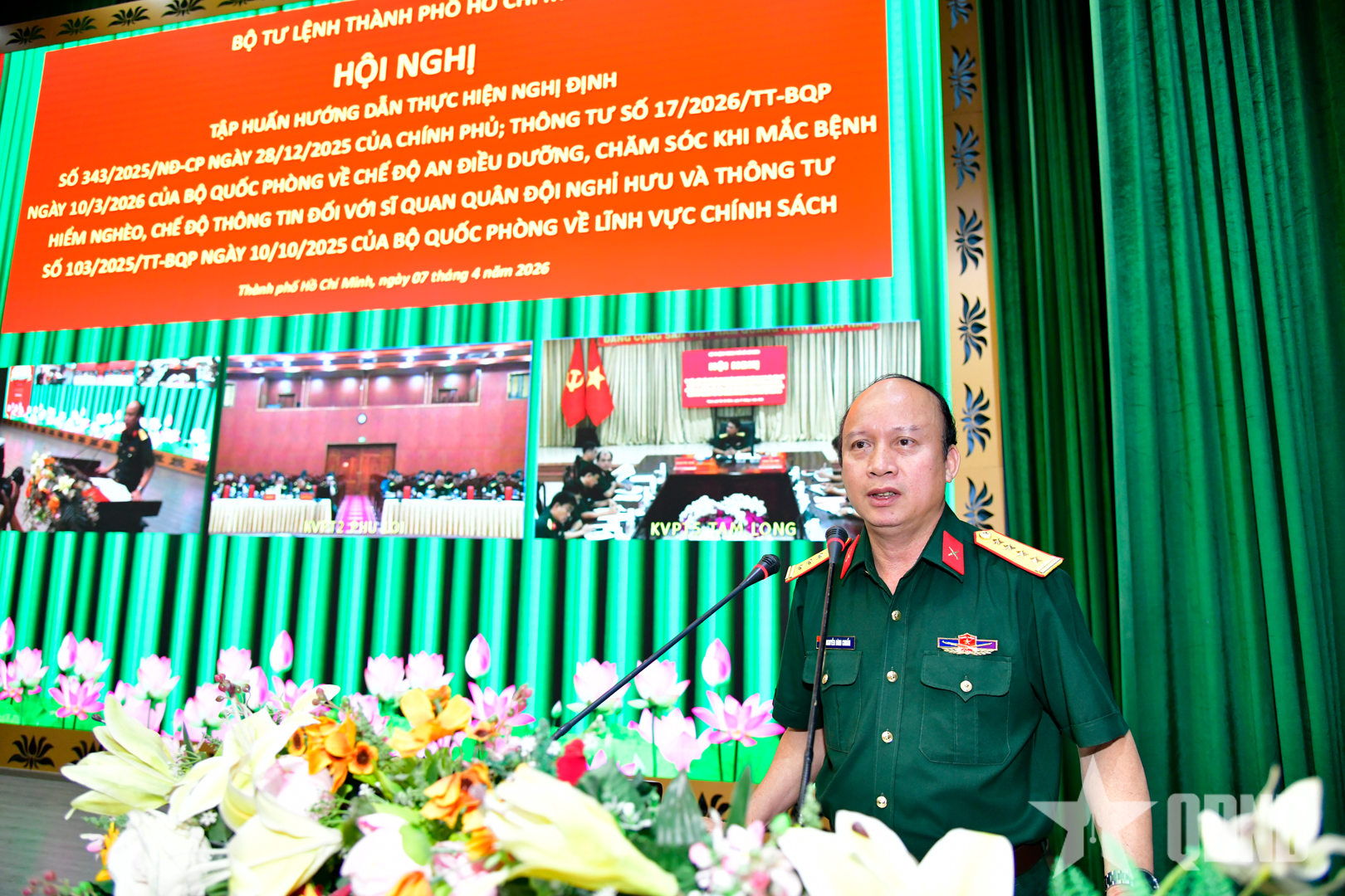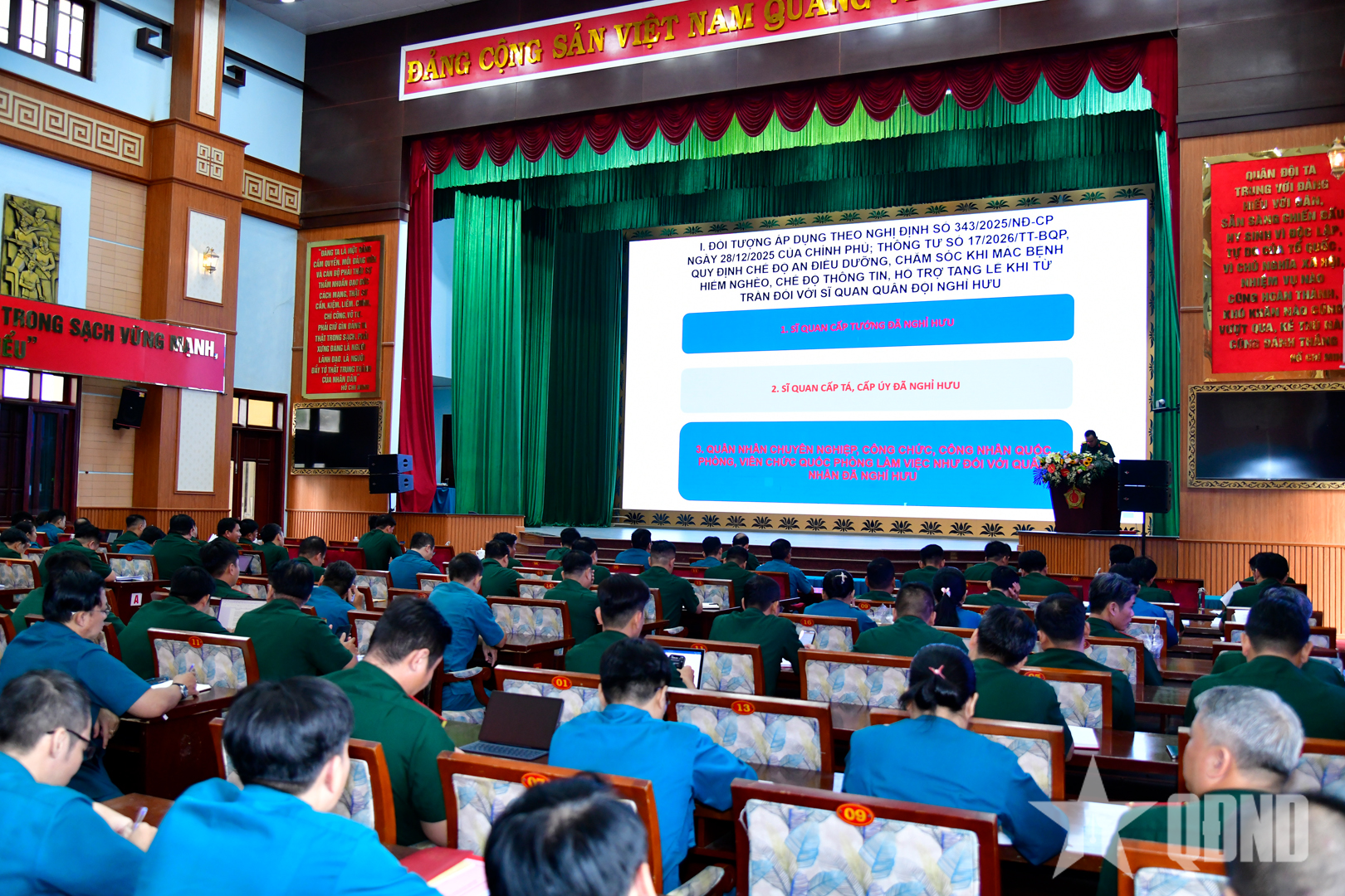 Cán bộ làm công tác chính sách tại các cơ quan, đơn vị trực thuộc Bộ tư lệnh TP Hồ Chí Minh đã được tập huấn, hướng dẫn thực hiện Nghị định số 343/2025/NĐ-CP ngày 28-12-2025 của Chính phủ; Thông tư số 17/2026/TT-BQP ngày 10-3-2026 của Bộ Quốc phòng về chế độ an điều dưỡng, chăm sóc khi mắc bệnh hiểm nghèo, chế độ thông tin, hỗ trợ tang lễ khi từ trần đối với sĩ quan quân đội nghỉ hưu; Thông tư số 103/2025/TT-BQP ngày 26-9-2025 của Bộ Quốc phòng về sửa đổi, bổ sung một số điều của các thông tư liên tịch, thông tư, quyết định của Bộ trưởng Bộ Quốc phòng về lĩnh vực chính sách.