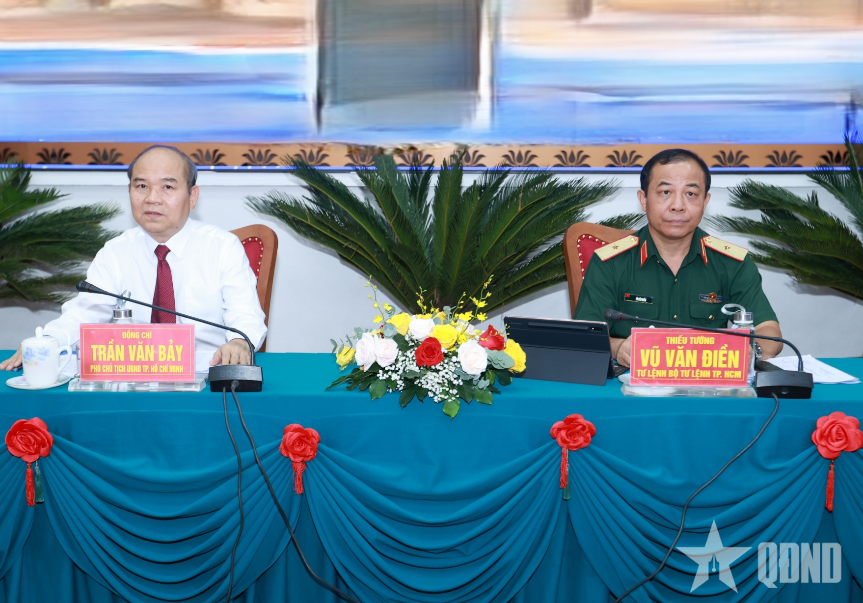 Đồng chí Trần Văn Bảy, Phó chủ tịch UBND TP Hồ Chí Minh và Thiếu tướng Vũ Văn Điền, Phó bí thư Đảng ủy, Tư lệnh Bộ tư lệnh TP Hồ Chí Minh tại hội nghị.