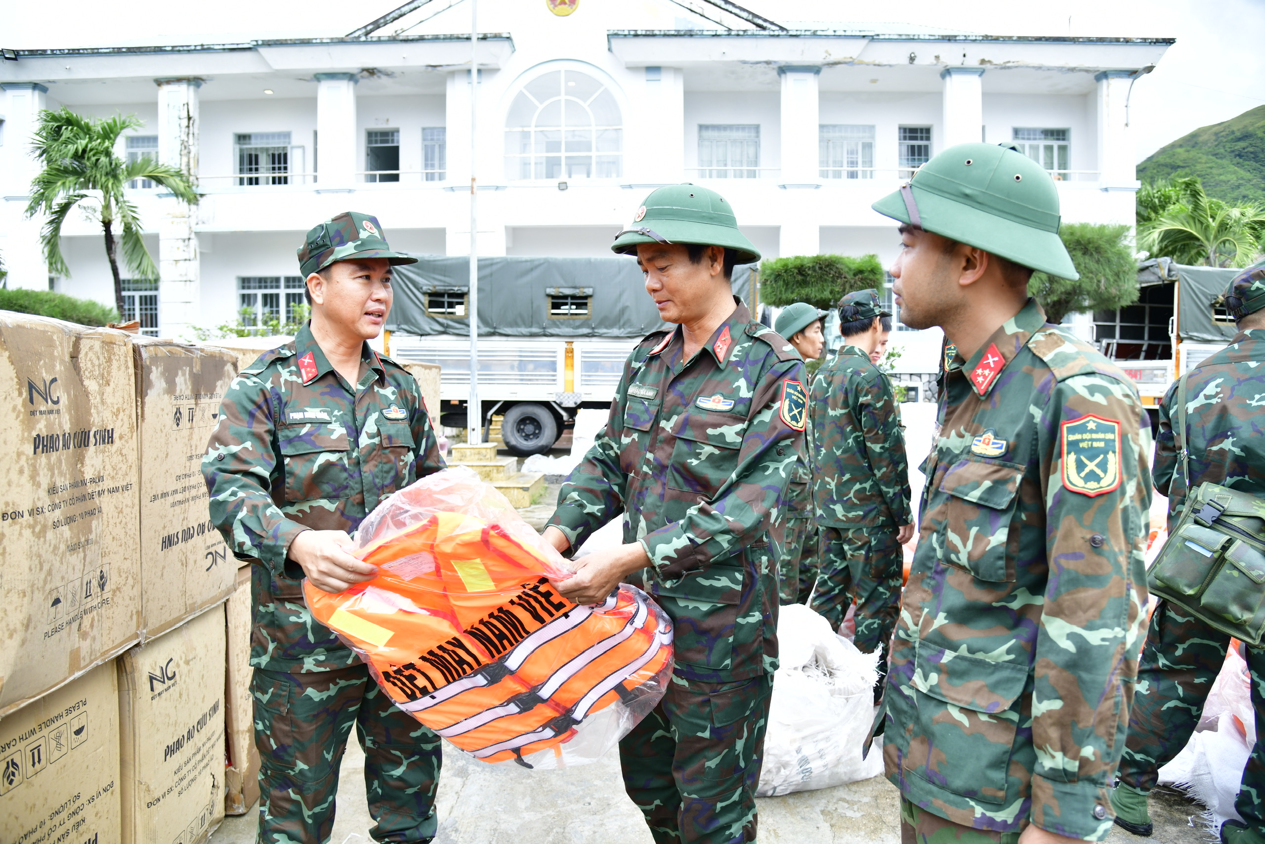 Lực lượng vũ trang TPHCM mang áo phao và phao cứu sinh hỗ trợ nhân dân tỉnh Khánh Hòa. Ảnh: HỮU TÂN