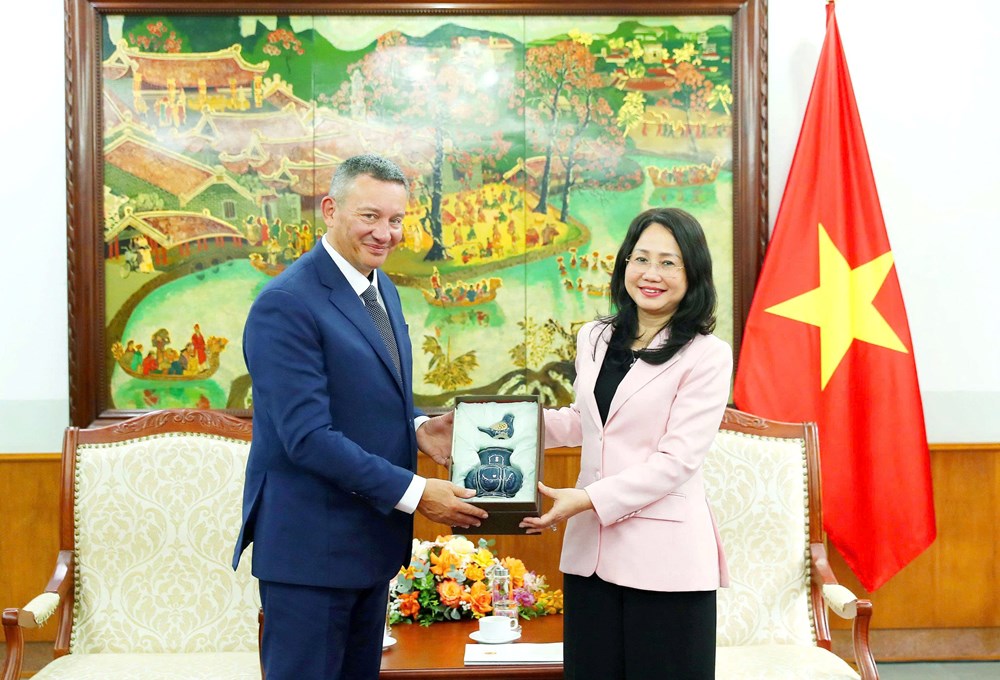 Bộ trưởng Lâm Thị Phương Thanh tặng quà lưu niệm cho ông Laurent Brunner