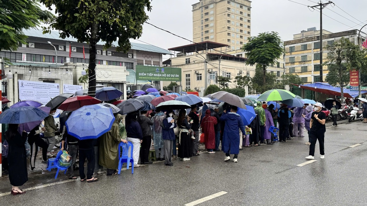 Người dân "đội mưa" xếp hàng nộp hồ sơ mua nhà ở xã hội.