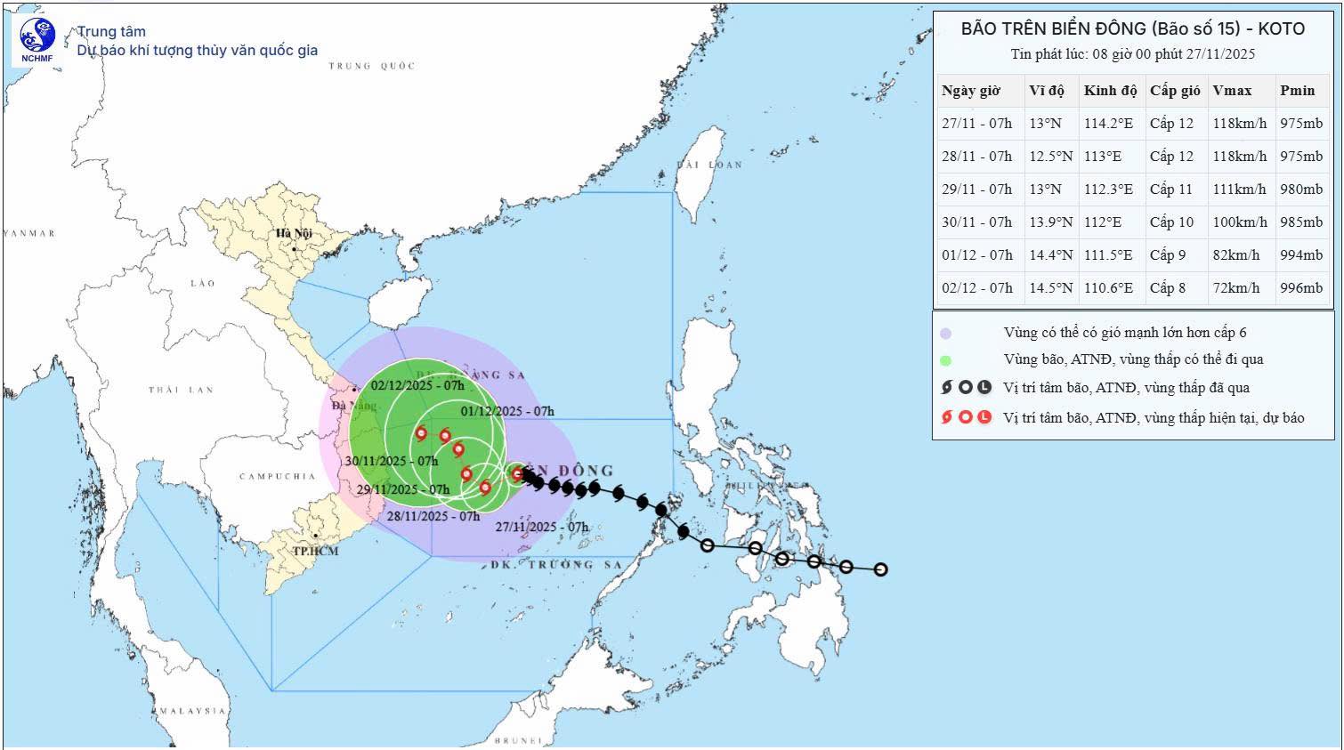 Theo Trung tâm Dự báo khí tượng thủy văn quốc gia, lúc 13 giờ ngày 27/11/2025, tâm bão ở khoảng 13,2° Vĩ Bắc - 113,5° Kinh Đông, cách đảo Song Tử Tây 190 km về phía Bắc. Sức gió mạnh nhất vùng gần tâm bão đạt cấp 12, giật cấp 15; bão di chuyển theo hướng Tây Tây Bắc với vận tốc khoảng 10 km/h.