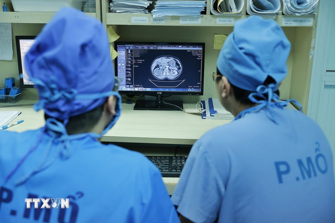Các bác sỹ Bệnh viện Đại học Y Hà Nội xem hồ sơ bệnh án của bệnh nhân trước khi vào phẫu thuật. (Ảnh: Minh Quyết/TTXVN)