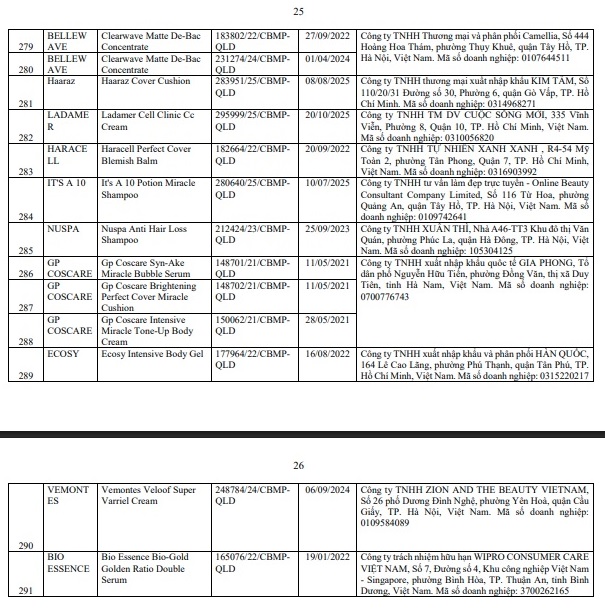 Theo đó, Cục Quản lý Dược thu hồi 291 số tiếp nhận Phiếu công bố sản phẩm mỹ phẩm, đình chỉ lưu hành và thu hồi trên toàn quốc tất cả các lô sản phẩm còn hạn sử dụng đối với 291 sản phẩm mỹ phẩm tại Danh mục kèm theo Quyết định này.