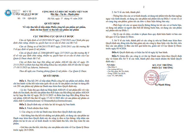 Lý do được Cục Quản lý Dược đưa ra là: Tuân thủ quy định tại Hiệp định ASEAN về mỹ phẩm đối với việc đình chỉ lưu hành, thu hồi sản phẩm theo Kết luận của Hội đồng mỹ phẩm ASEAN tại kỳ họp lần thứ 42 ngày 20-21/11/2025 và Biên bản họp Hội đồng Khoa học mỹ phẩm ASEAN lần thứ 42 ngày 17-18/11/2025 đối với sản phẩm mỹ phẩm có chứa chất Cyclotetrasiloxane và Octamethylcyclotetrasiloxane.