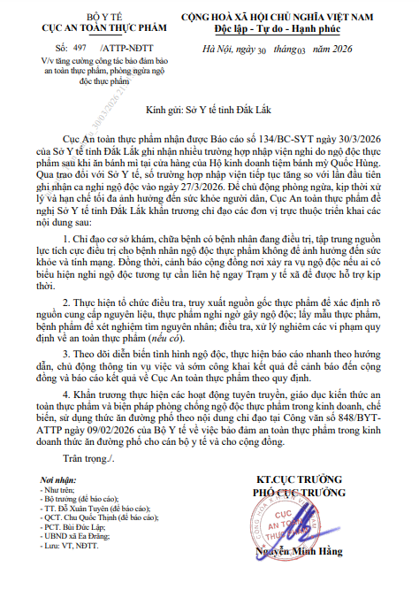 Công văn nêu rõ, Cục An toàn thực phẩm (Bộ Y tế) nhận được Báo cáo số 134/BC-SYT ngày 30/3 của Sở Y tế tỉnh Đắk Lắk ghi nhận nhiều trường hợp nhập viện nghi do ngộ độc thực phẩm sau khi ăn bánh mì tại cửa hàng của Hộ kinh doanh tiệm bánh mì Quốc Hùng.