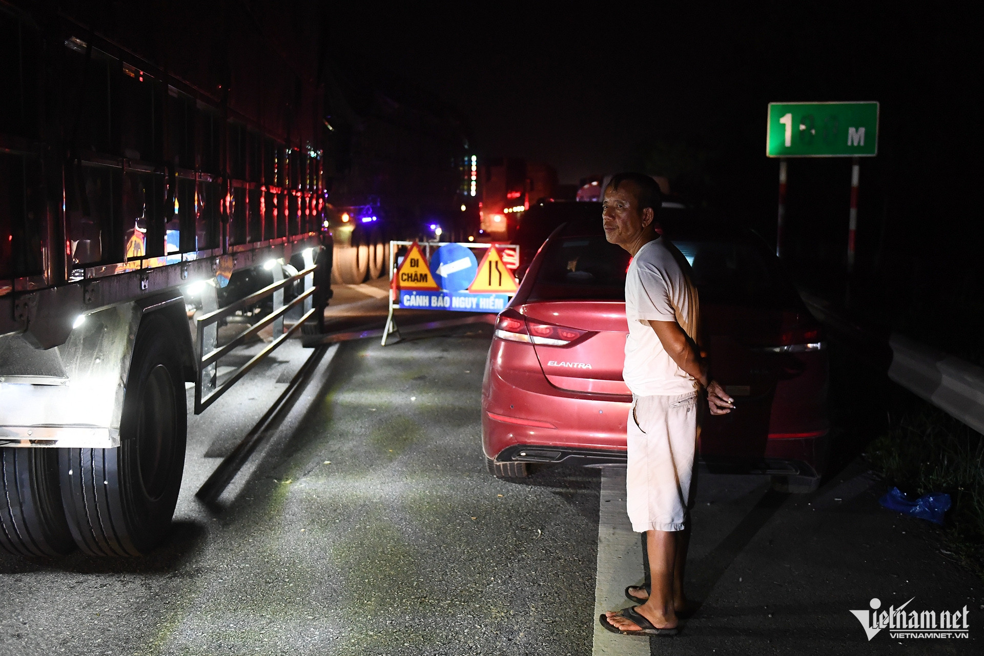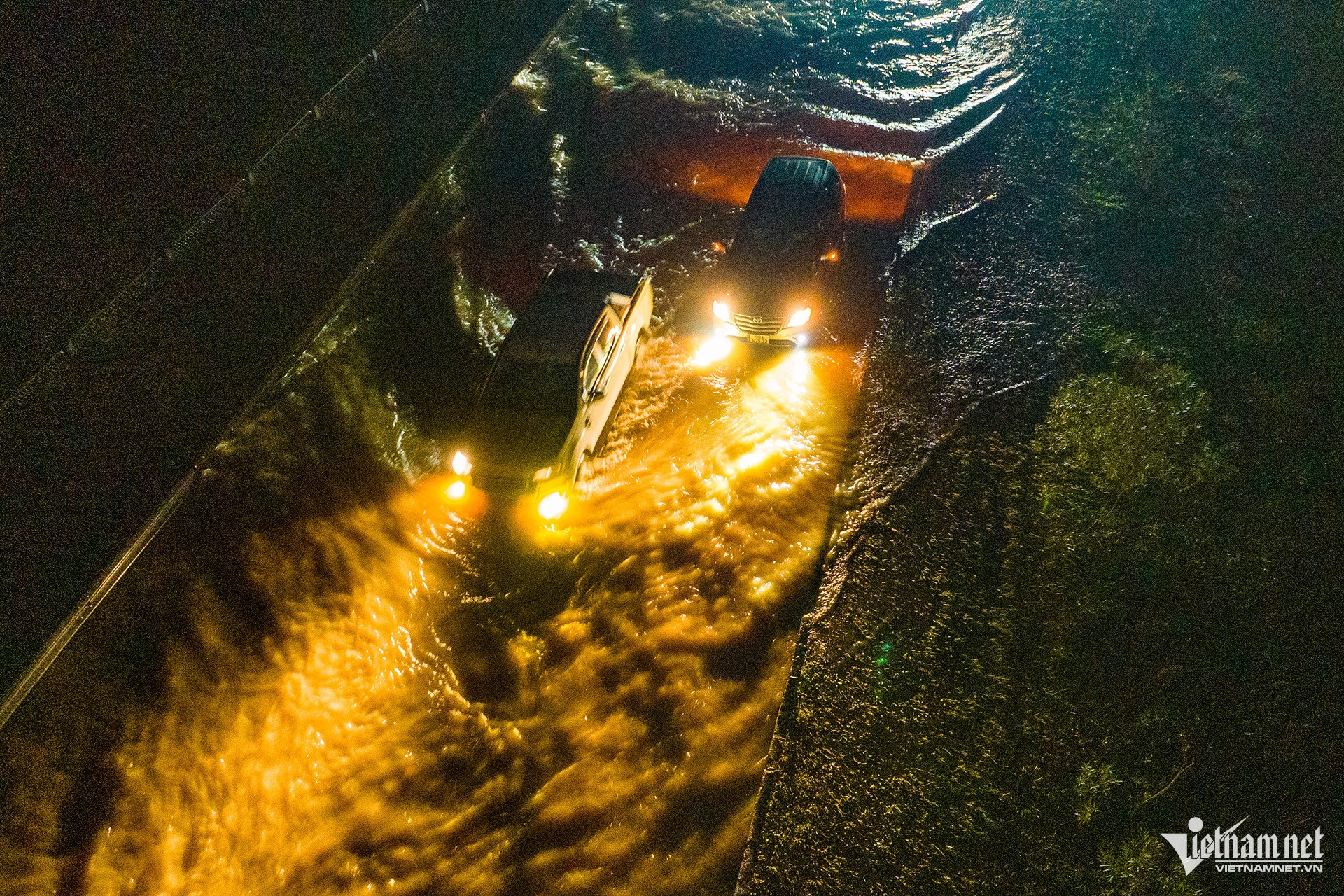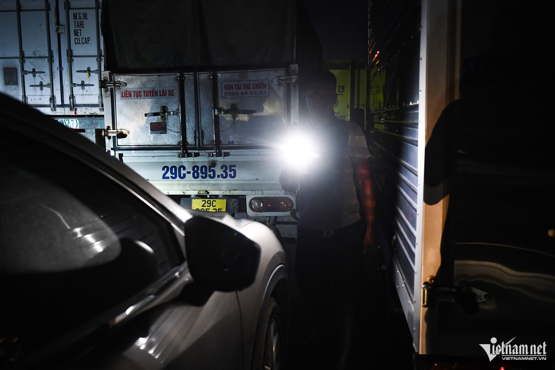 Tại đoạn khô ráo đầu đoạn ngập, nhiều xe tải nhỏ, ô tô phân khúc sedan, thậm chí cả CUV, SUV gầm cao cũng được chủ xe cho dừng chờ nước rút thêm. Một tài xế dùng đèn pin đi lại ngó nghiêng tình hình ngập lụt.