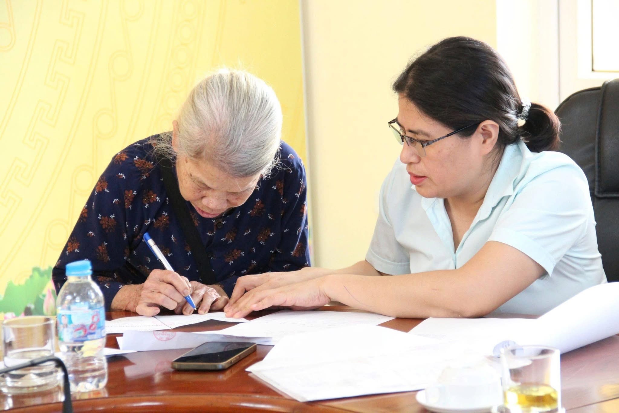 Cán bộ Ban Quản lý dự án Đầu tư - Xây dựng xã Hòa Lạc hướng dẫn người dân ký xác nhận kết quả bốc thăm vị trí thửa đất. Ảnh: PV