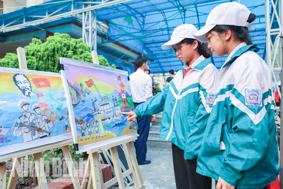 Học sinh tham quan triển lãm tranh cuộc thi “Em yêu biển, đảo quê hương” vòng thi cấp tỉnh tổ chức tại trường THCS Nghĩa Tân.