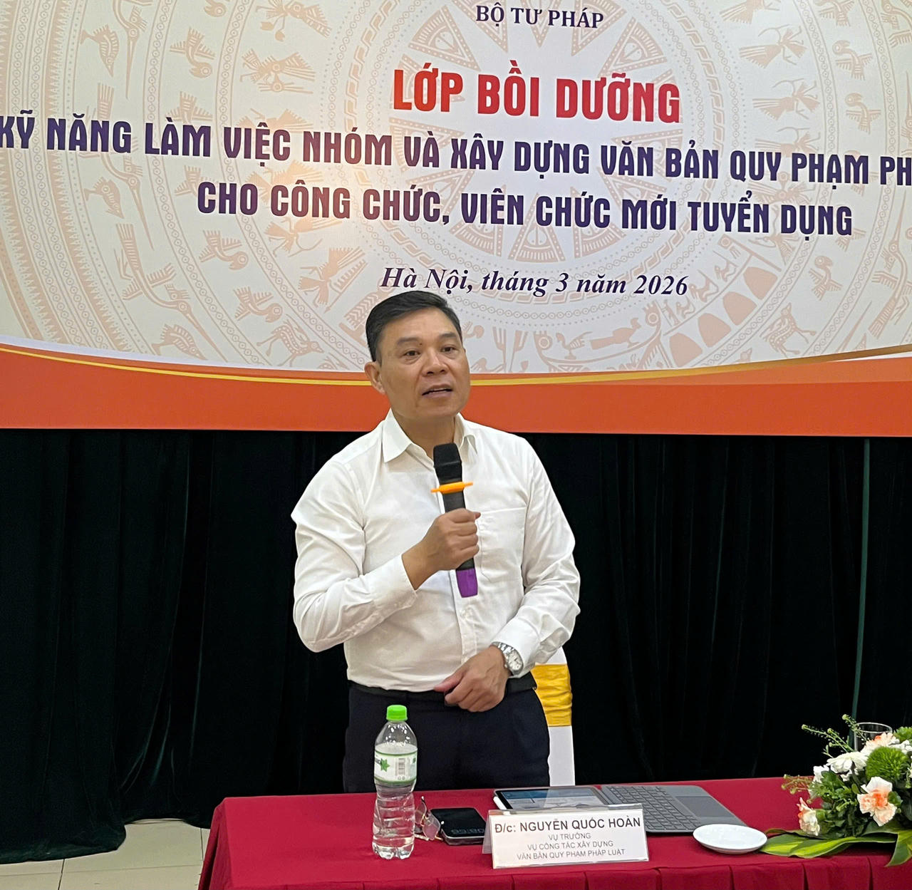 Sau chương trình khai giảng, Vụ trưởng Vụ Công tác xây dựng văn bản quy phạm pháp luật Nguyễn Quốc Hoàn đã truyền đạt, trao đổi Chuyên đề 1 với các nội dung: đổi mới tư duy trong xây dựng pháp luật; kỹ năng soạn thảo văn bản quy phạm pháp luật; ứng dụng công nghệ số vào công tác soạn thảo, thẩm định văn bản quy phạm pháp luật.