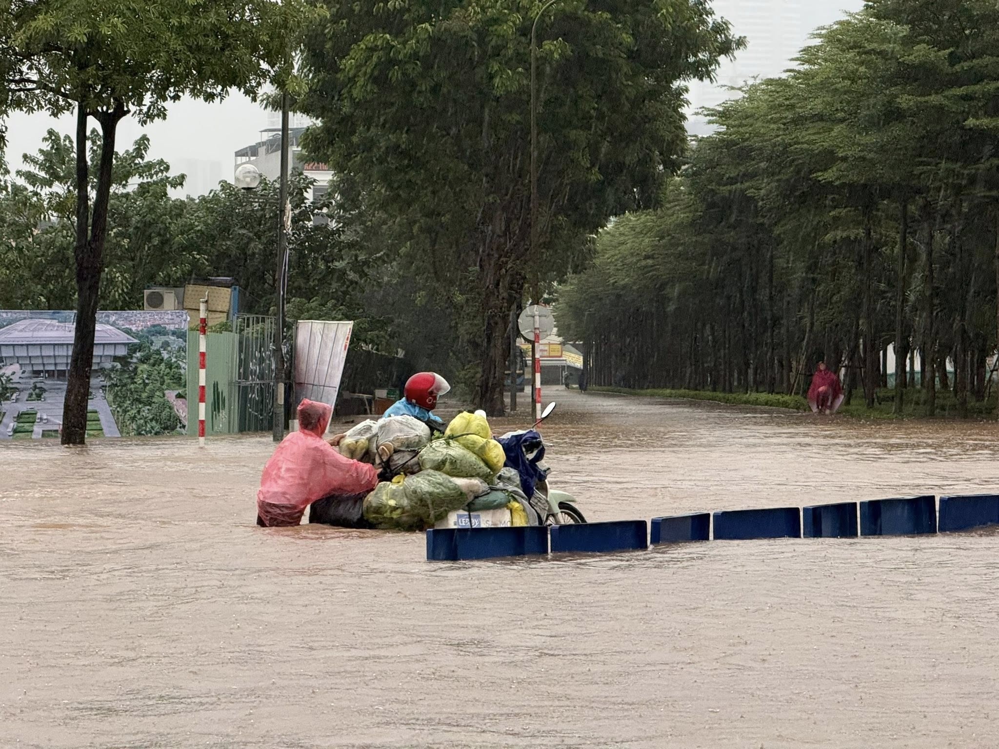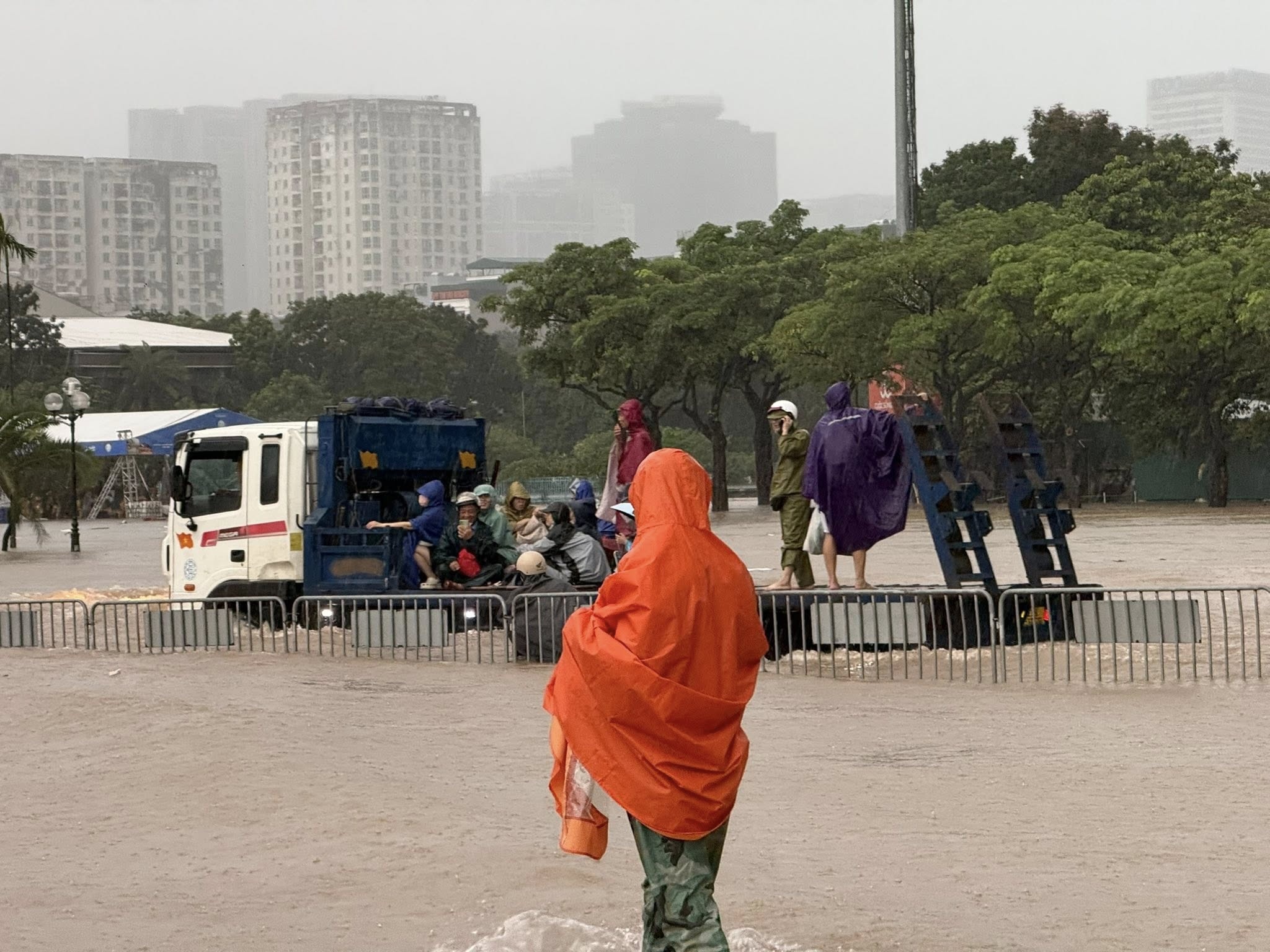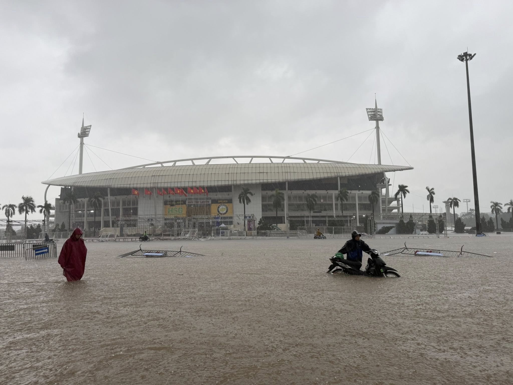 Theo Trường, nước tại khu vực phía trước sân vận động ngập sâu tới ngang hông, gần sát yên xe máy. Có người còn bơi luôn trong dòng nước ngập vì quá bất lực.