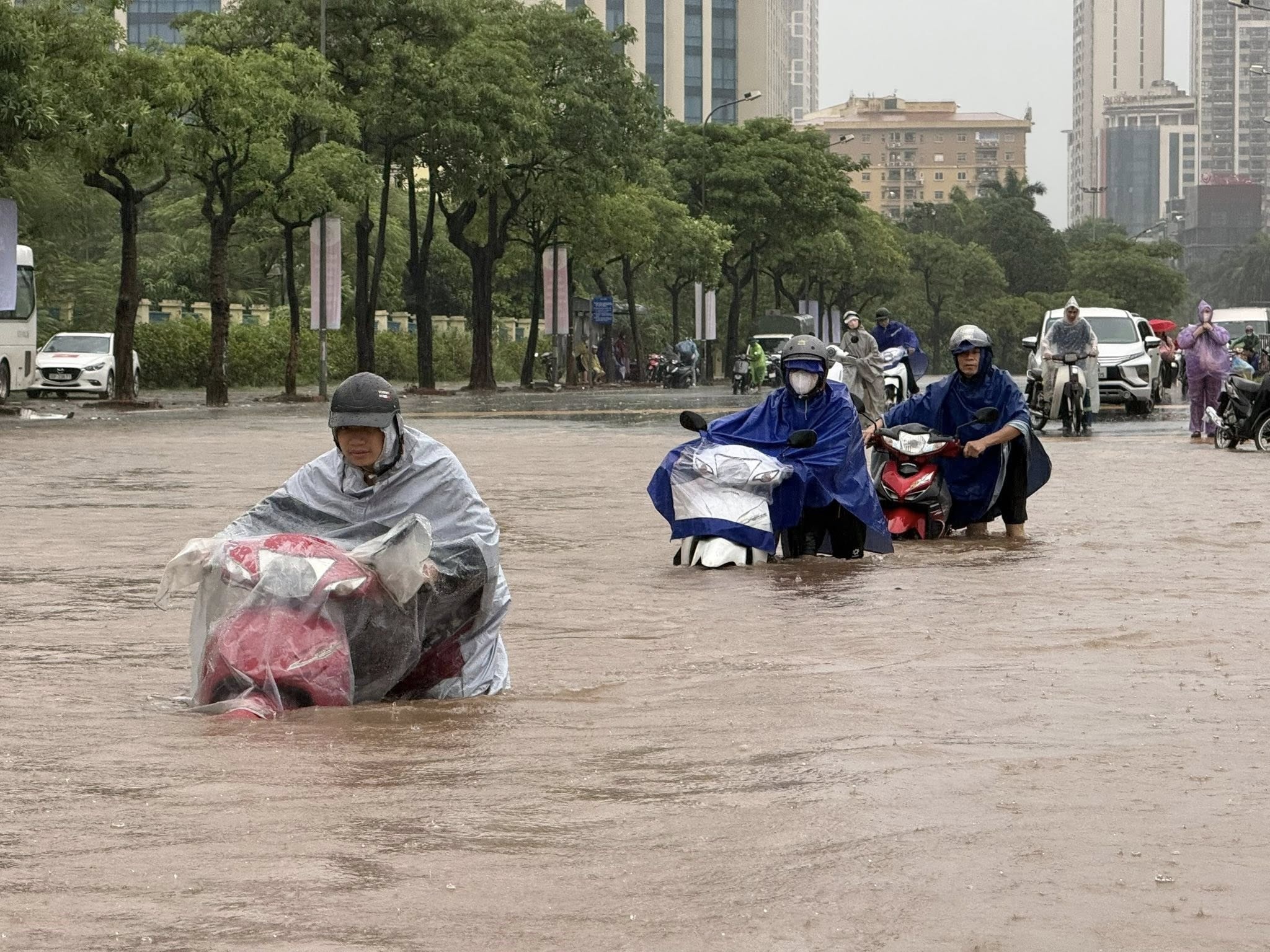 "Khoảng 7h40, khu vực sân vận động Mỹ Đình ngập khá sâu. Nhiều người phải vừa mặc áo mưa vừa dắt xe lội qua dòng nước ngập mênh mông. Một số còn bị xô đổ, đứng không vững mỗi khi có xe buýt lội qua, gây ra những đợt sóng nước mạnh", Trường chia sẻ với Tri Thức - Znews.