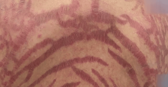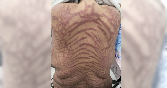 Theo thời gian, cơ thể của người phụ nữ bắt đầu xuất hiện nhiều dấu hiệu bất thường: da nổi các vệt nứt đỏ tím kéo dài như da rắn, mặt sưng tròn, tăng cân nhanh, huyết áp cao, thường xuyên mệt mỏi và đau bụng. Khi tình trạng trở nên nghiêm trọng, cô mới được gia đình đưa đến bệnh viện.