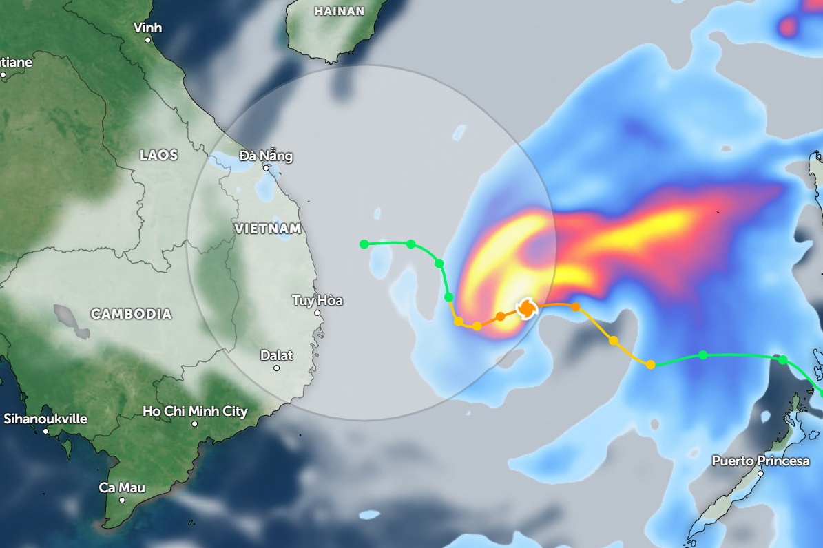 Dự báo hướng đi và vùng ảnh hưởng của bão số 15, lúc 9h ngày 27/11. Ảnh: Zoom Earth.