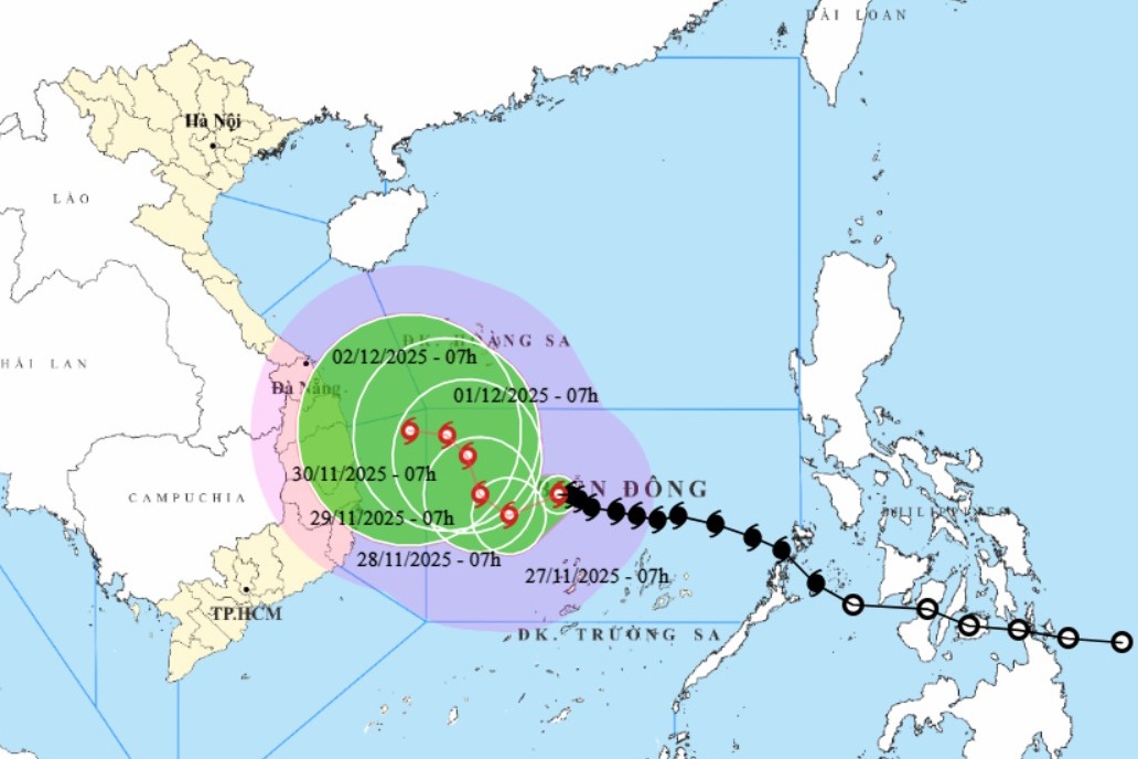 Trong kịch bản chính (70%), bão đổi hướng khi còn cách Khánh Hòa - Gia Lai khoảng 450-500 km, gây mưa 50-100 mm từ Đà Nẵng đến Lâm Đồng trong ngày 1-2/12.