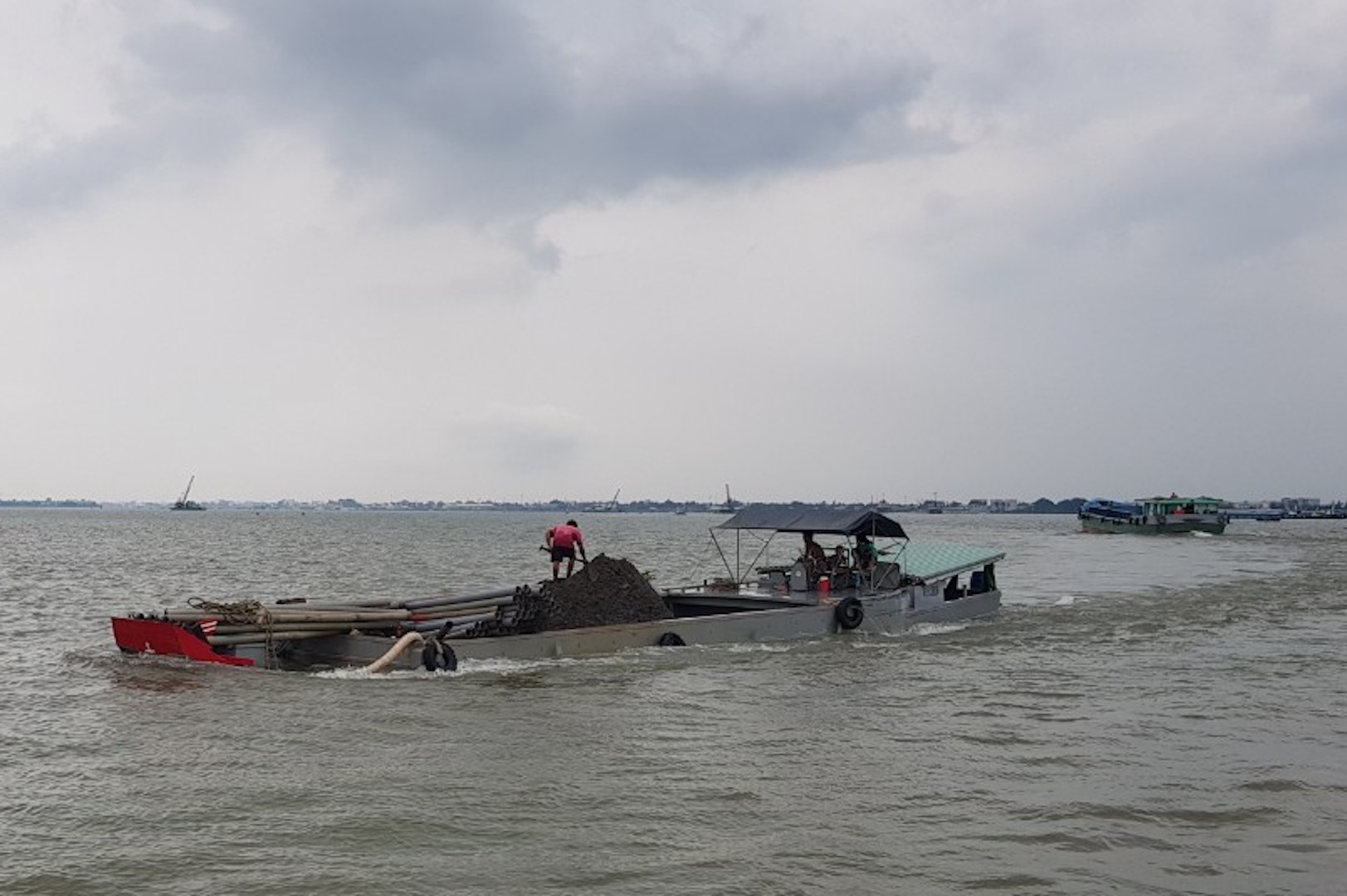 Lực lượng CSGT Công an tỉnh An Giang kiểm tra phương tiện chở cát trên sông Tiền.