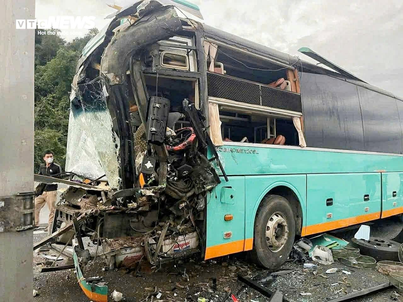 Vụ tai nạn liên hoàn khiến phần đầu xe khách vỡ vụn. ( Ảnh Công an cung cấp)