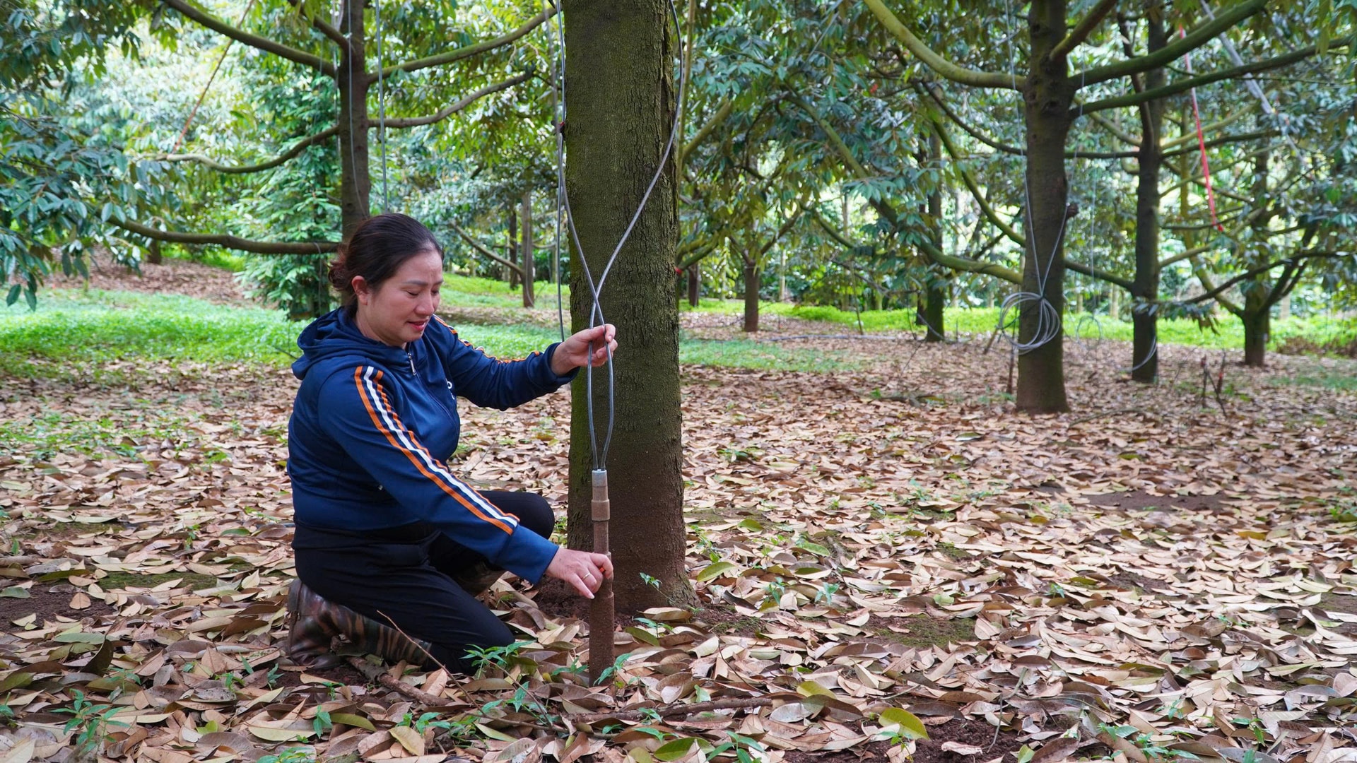 Cuối năm 2025, anh Huy đầu tư hơn 200 triệu đồng lắp đặt hệ thống phun xịt thuốc cho toàn bộ vườn sầu riêng. Theo anh Huy, chăm sóc sầu riêng cần tuân thủ quy trình nghiêm ngặt, phân thuốc phải được sử dụng thường xuyên và đúng thời điểm sinh trưởng. Việc phun thủ công không chỉ mất nhiều công lao động mà còn khó đáp ứng yêu cầu kỹ thuật, nhất là những đợt sâu bệnh bùng phát nhanh, trong khi cây sầu riêng cao, tán lớn.