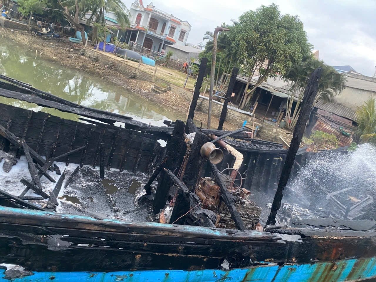 Ngoài ra, tàu cá QNg 95138 TS của bà Bùi Thị Tường Vy (trú thôn Phước Thiện, xã Vạn Tường), dài 20m, công suất 400CV, cũng bị cháy, ước tính thiệt hại trên 70%.