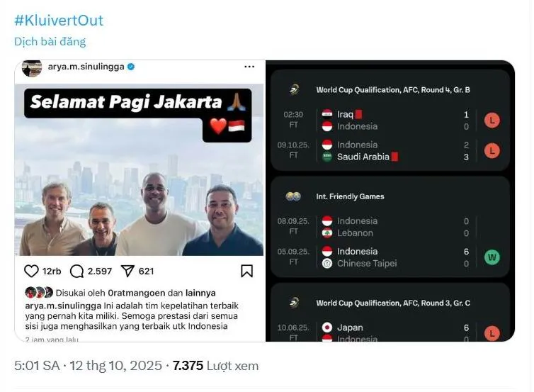 Trên nền tảng X (trước đây là Twitter), mạng xã hội được sử dụng phổ biến nhất ở Indonesia, cộng đồng mạng đồng loạt “đặt hashtag” #Erikout (Erick Thohir) ra đi, #Kluivertout. Những dòng “hashtag” trên như một trào lưu, họ đòi tỉ phú Erick Thohir phải rời ghế chủ tịch, còn HLV Patrick Kluivert cũng phải ra đi luôn.