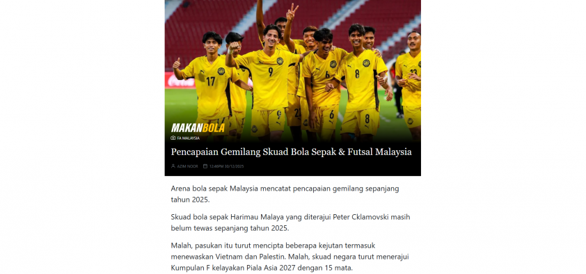 Dưới sự dẫn dắt của HLV Peter Cklamovski, đội tuyển quốc gia Malaysia duy trì thành tích bất bại tuyệt đối trong năm 2025. Tại vòng loại Asian Cup 2027, "Bầy hổ Malaya" đang độc chiếm ngôi đầu bảng F với 15 điểm sau 5 trận toàn thắng.