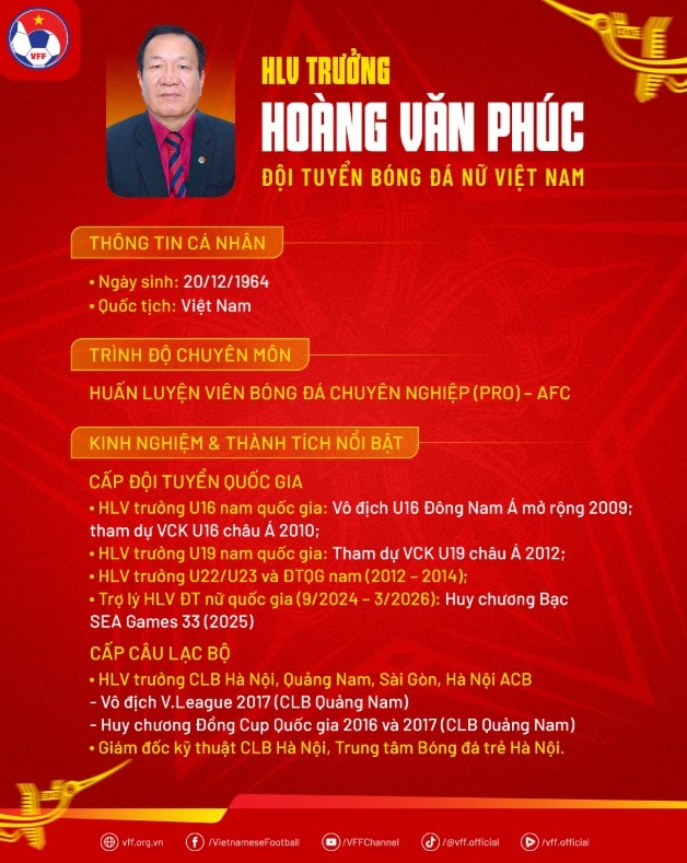 Thông tin về HLV trưởng Đội tuyển bóng đá nữ Việt Nam Hoàng Văn Phúc - Ảnh: VFF
